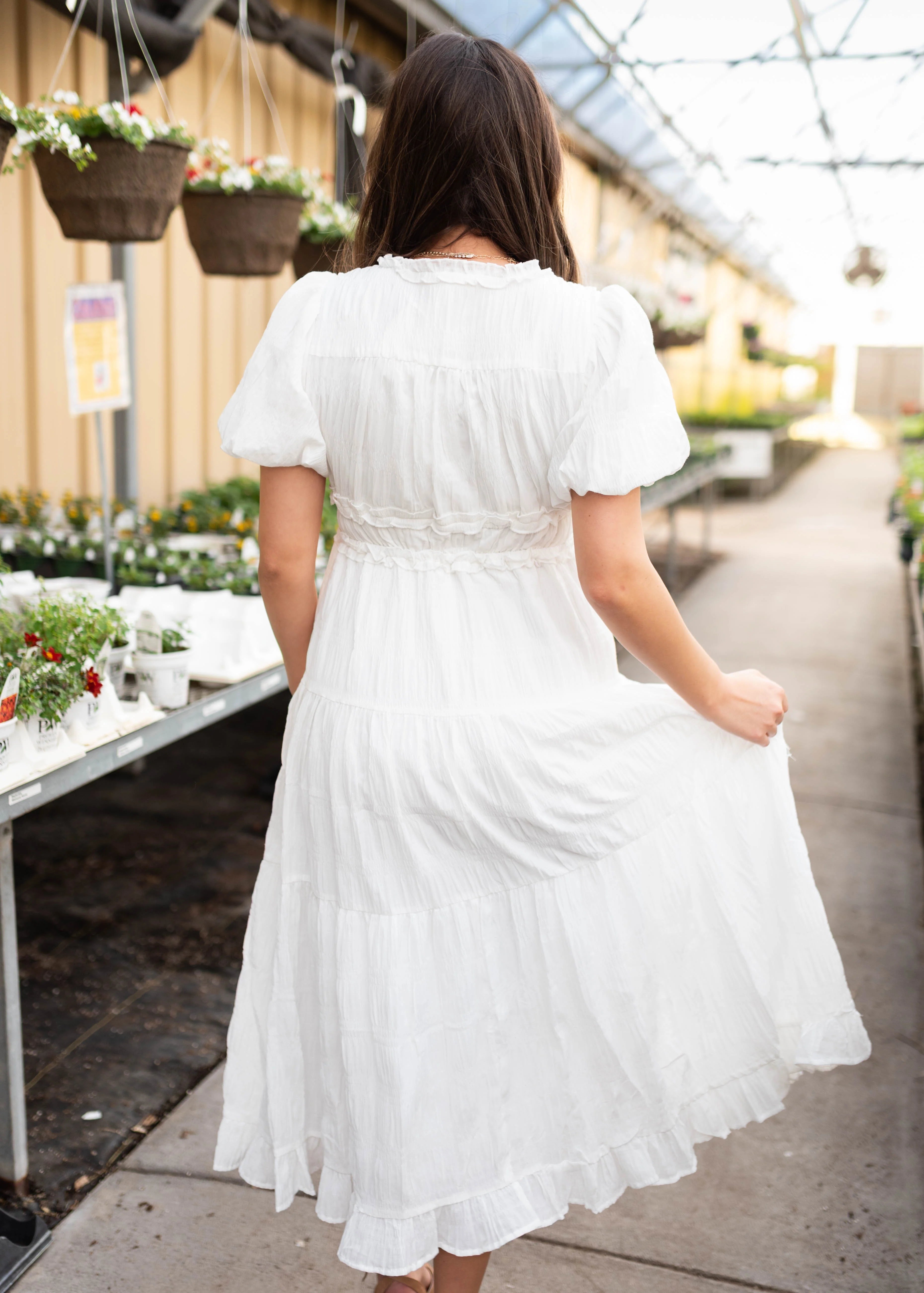 Fresh, feminine, and effortlessly pretty — the Addyson White Ruffle Dress is a go-to piece that feels light and lovely the moment you put it on. Designed in a textured white fabric, this dress features a flattering v neckline and soft puff sleeves for a romantic touch. The elastic waist creates a comfortable, easy fit, while the tiered skirt adds beautiful movement and flow. Fully lined and not see-through with pockets (yes, really!), it’s as practical as it is pretty.