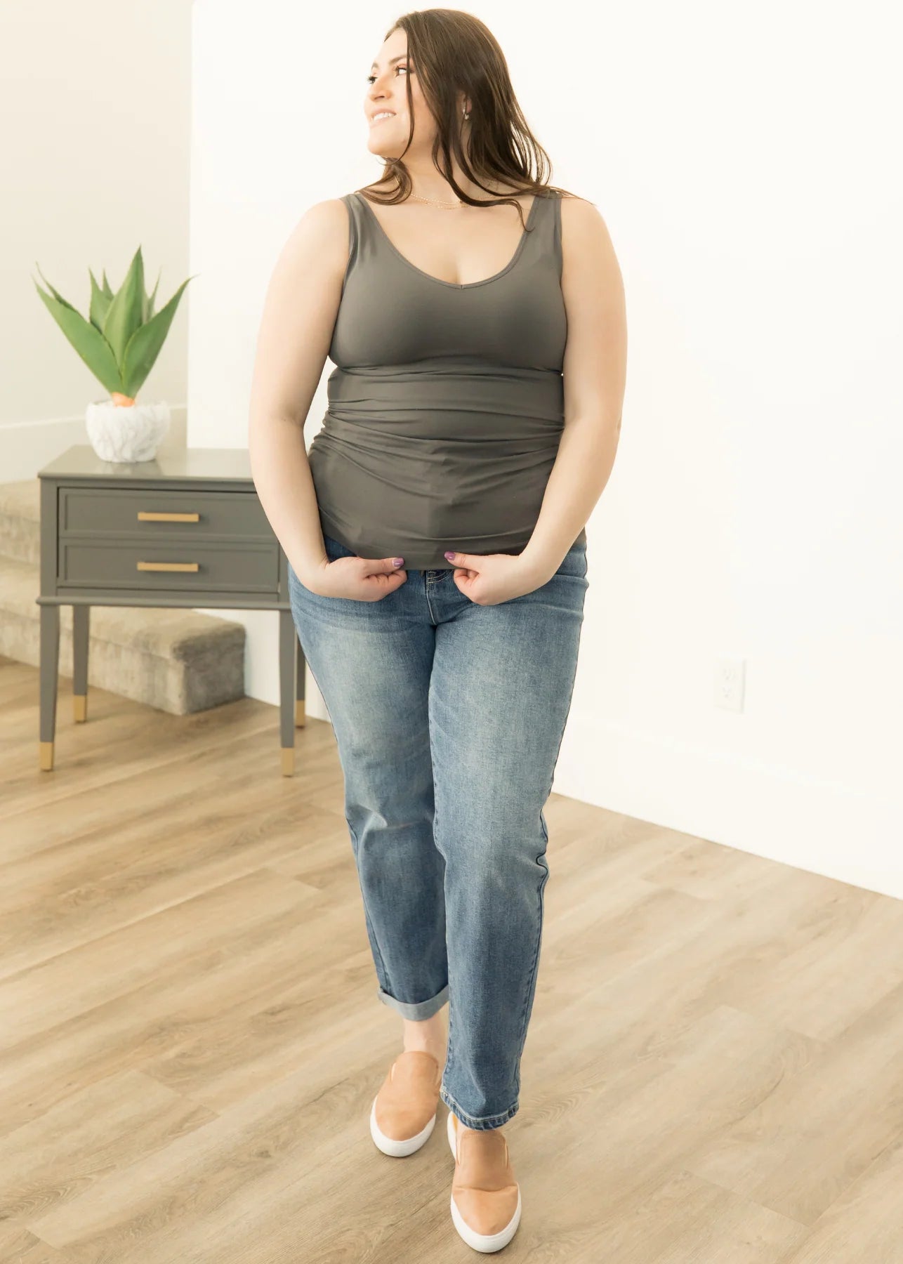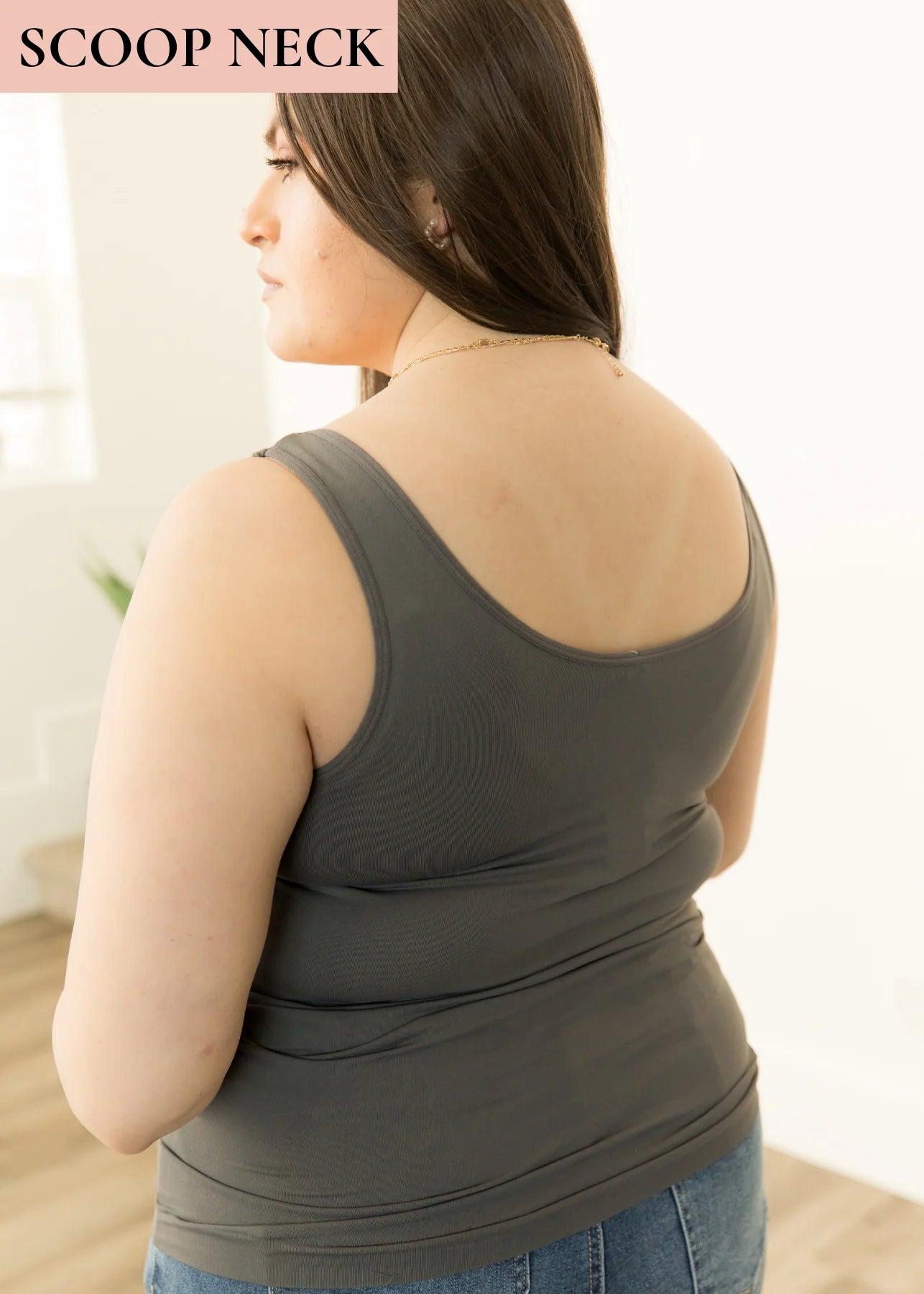 Meet our our new tank top obsession: The Alena Reversible Seamless Tank! A soon-to-be best seller and it's clear why. This high-quality seamless tank features a v-neckline and a scoop neckline, so you can style it 2 ways depending on your outfit! Style it with the v-neck in front and the scoop neck on back, or the other way around! It's a MUST-HAVE.