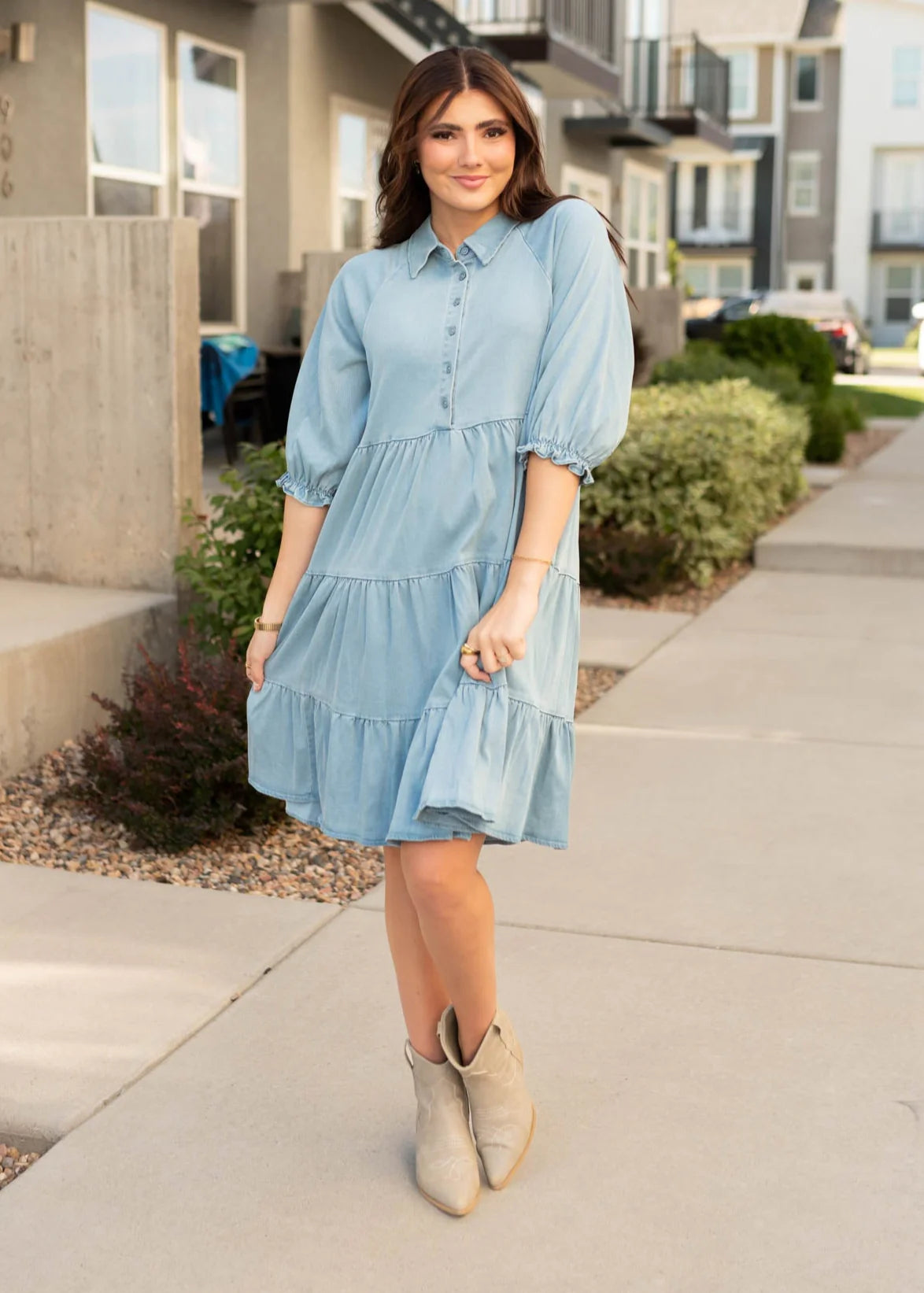 Meet Anna—the chambray dress that’s equal parts classic and fun. With its tiered skirt, elastic sleeves, and full button-down front, this one is easy to style and even easier to love. The soft fabric has just a bit of stretch, and the nursing-friendly design makes it a go-to for busy days. Plus, you know we added pockets!