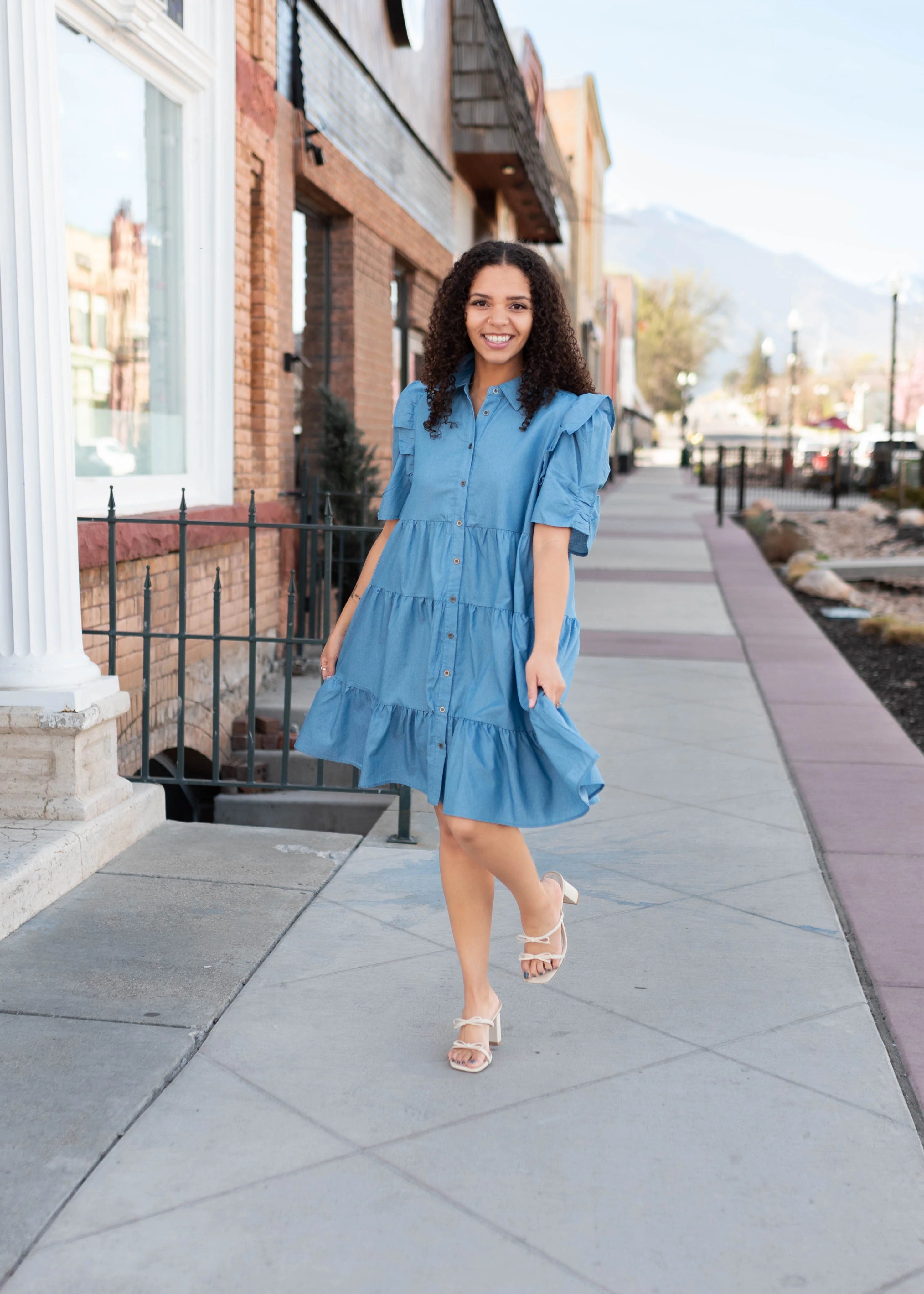 Cute, casual, and effortlessly easy to wear — the Annabelle Chambray Collared Dress is a fun everyday favorite you’ll reach for again and again. Designed in a soft chambray fabric, this dress features a classic collared neckline and button-up front that give it a polished feel. The ruffle sleeves add a feminine touch, while the tiered skirt and flowy fit create beautiful movement and all-day comfort. With its mini length, it’s a playful piece that’s still easy to style for so many occasions.