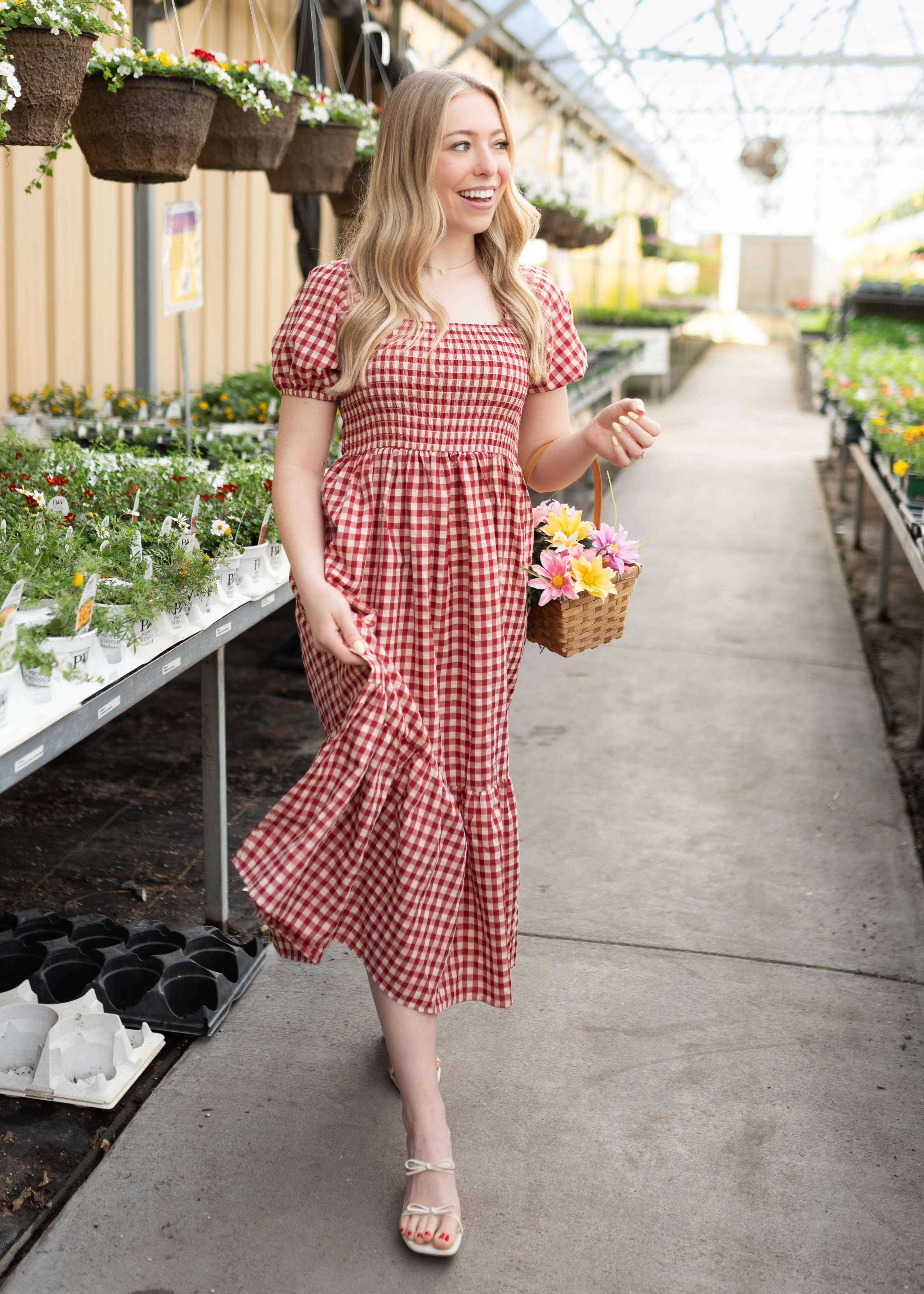 Bright, playful, and full of charm — the Bridget Red Gingham Dress is a fun take on a classic favorite. Designed in a cheerful red gingham print, this dress features a flattering square neckline finished with delicate ruffle details for an extra feminine touch. The smocked bodice creates a comfortable, flexible fit, while puff sleeves add soft volume. A single tiered skirt gives it just the right amount of movement, and of course… it has pockets.