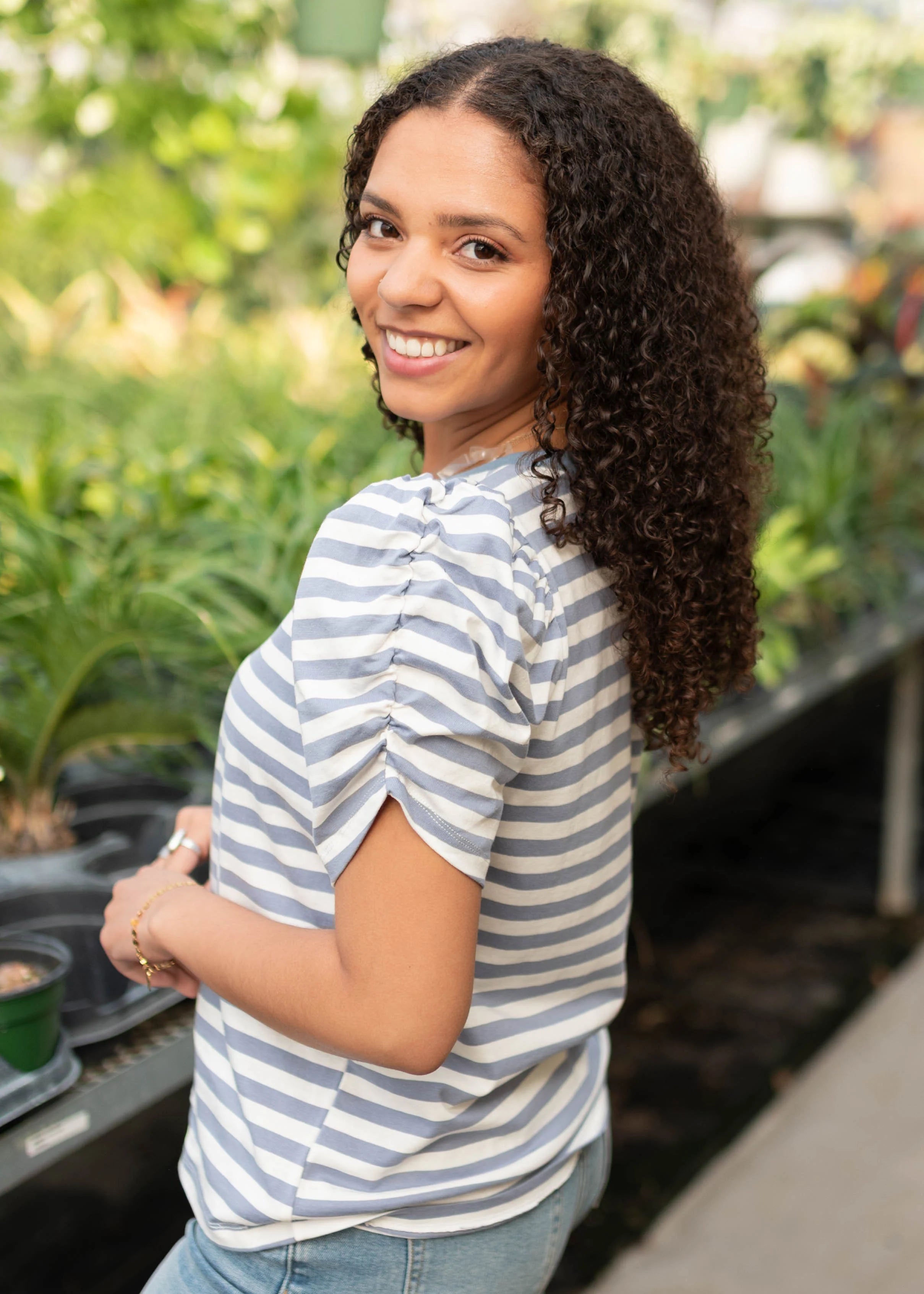Fresh, flirty, and effortlessly versatile, the Brooklynn Blue Striped Top brings classic stripes and a touch of feminine detail to your spring wardrobe. Its cinched puff sleeves and soft stretch make it flattering yet comfortable for everyday wear.