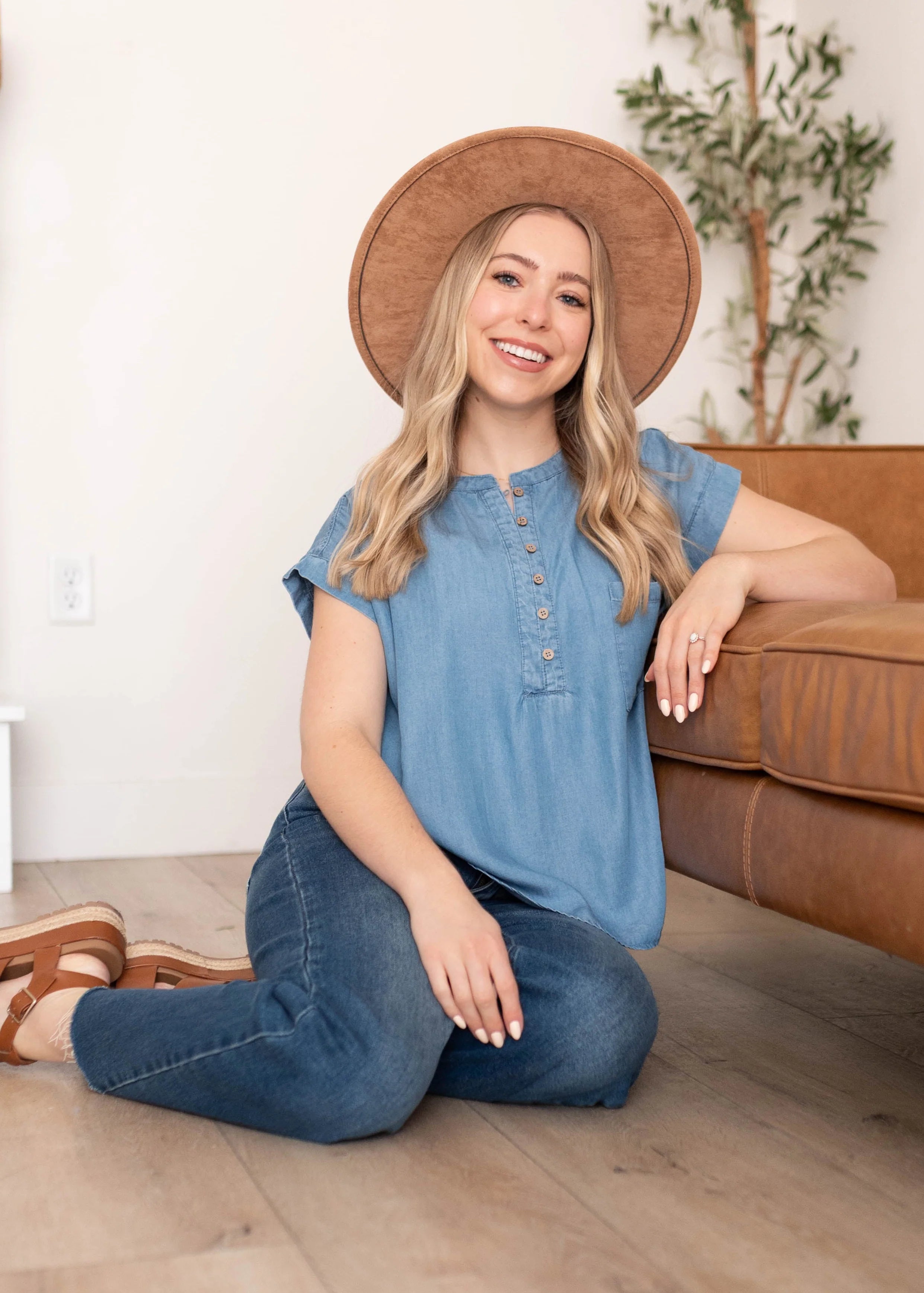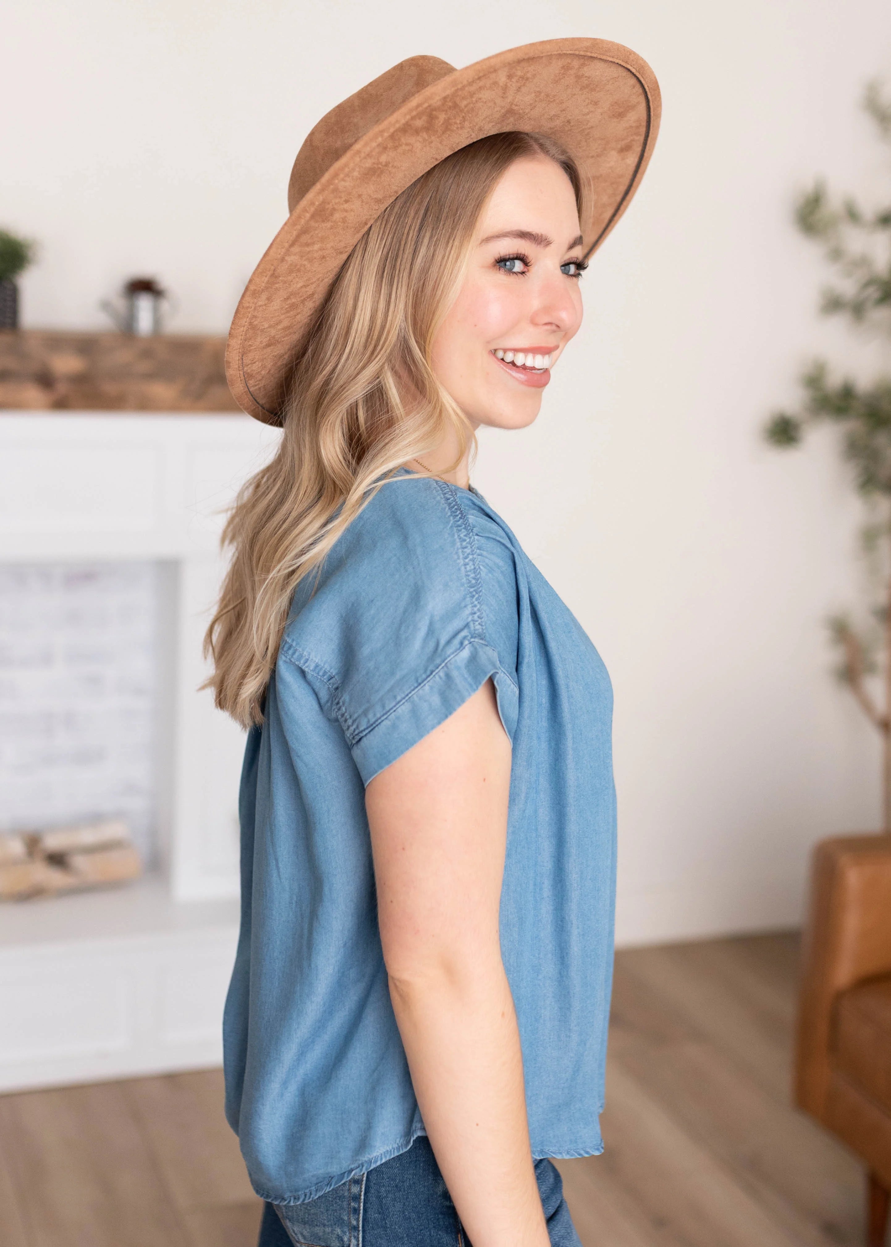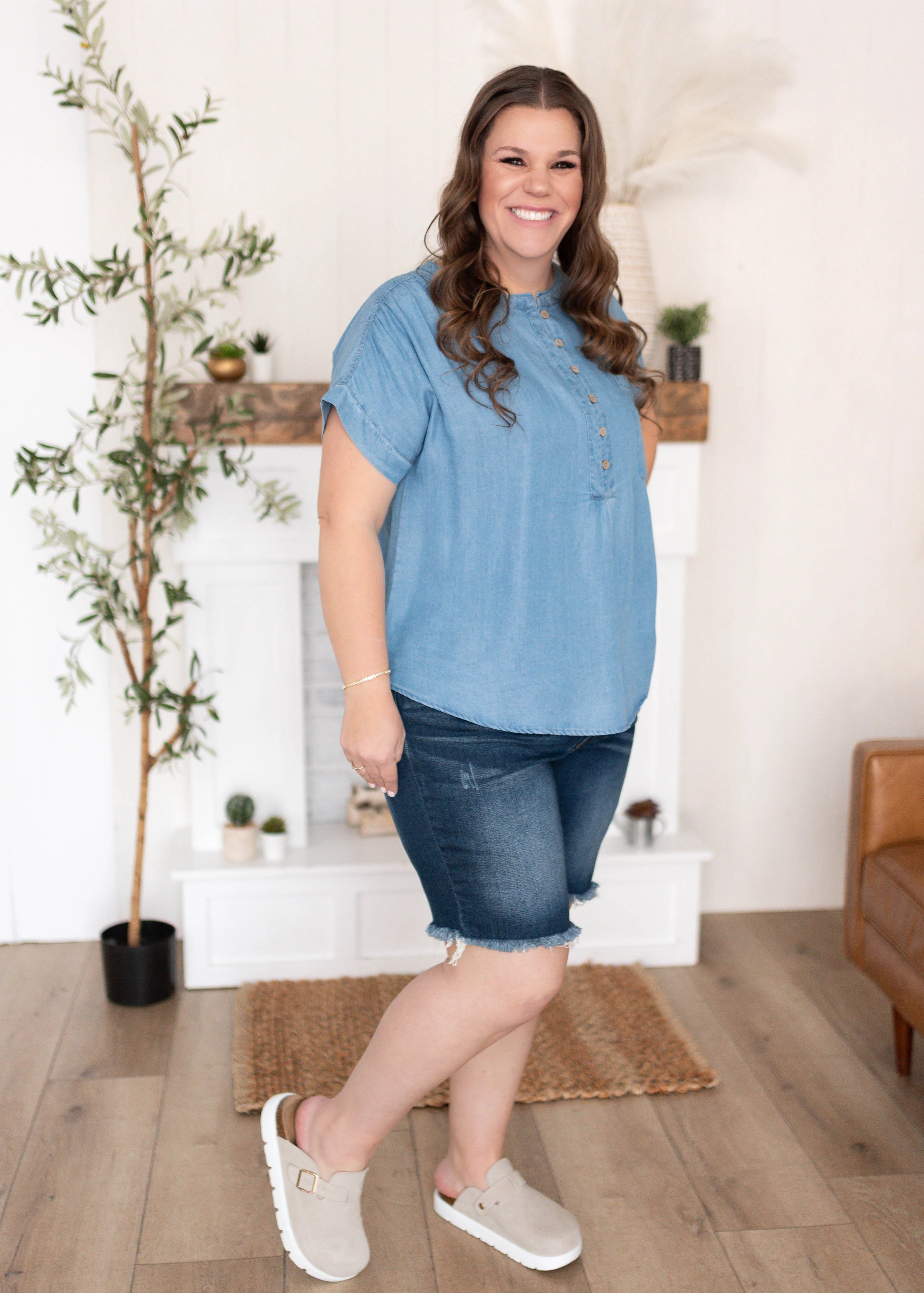 The Brynlee Blue Chambray Top is an easy, everyday essential with a timeless feel. Crafted from soft chambray, it’s lightweight and breathable with a relaxed look that works year-round. The partial button-up front and short sleeves keep it casual and effortless, making it a piece you’ll reach for again and again.