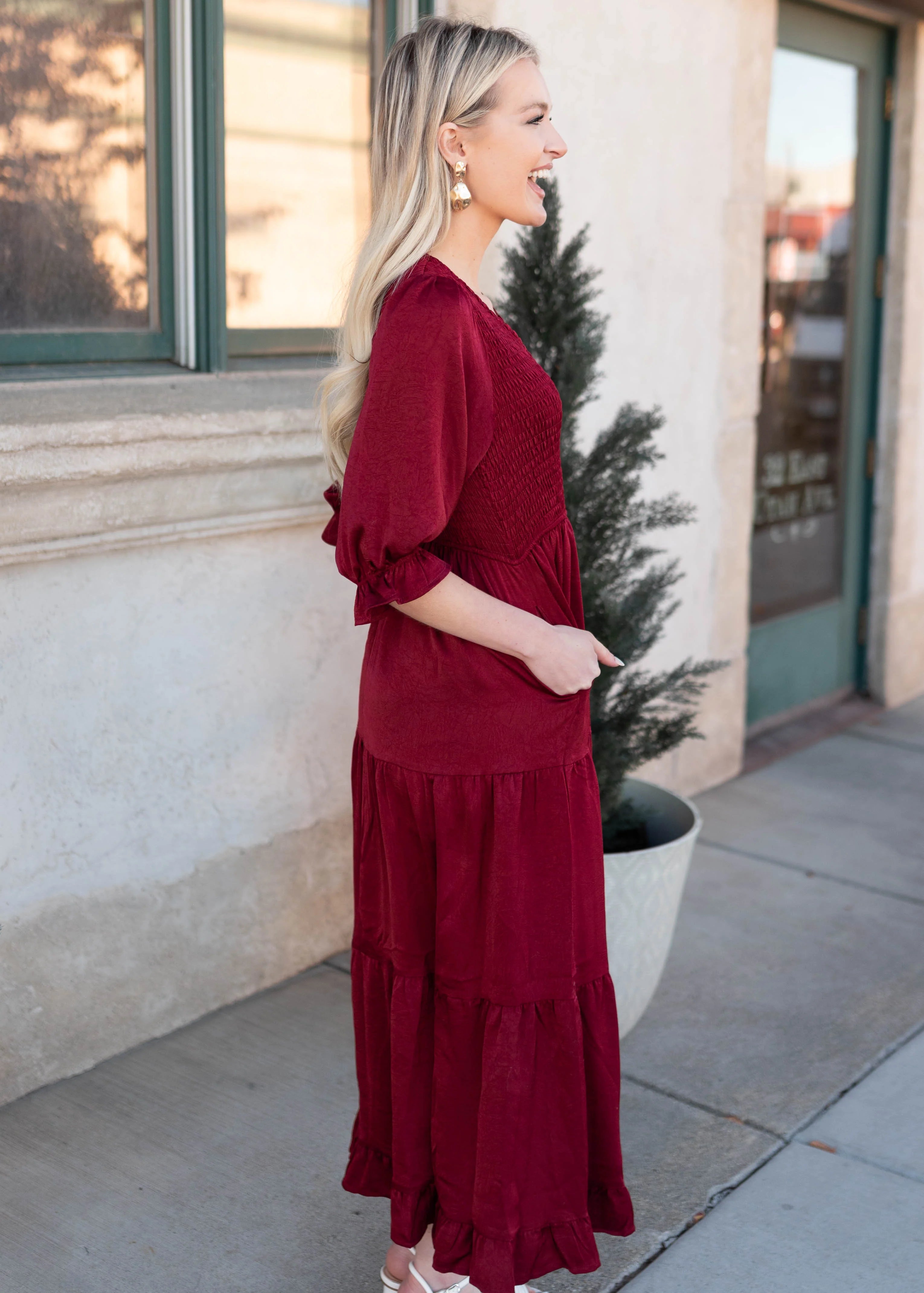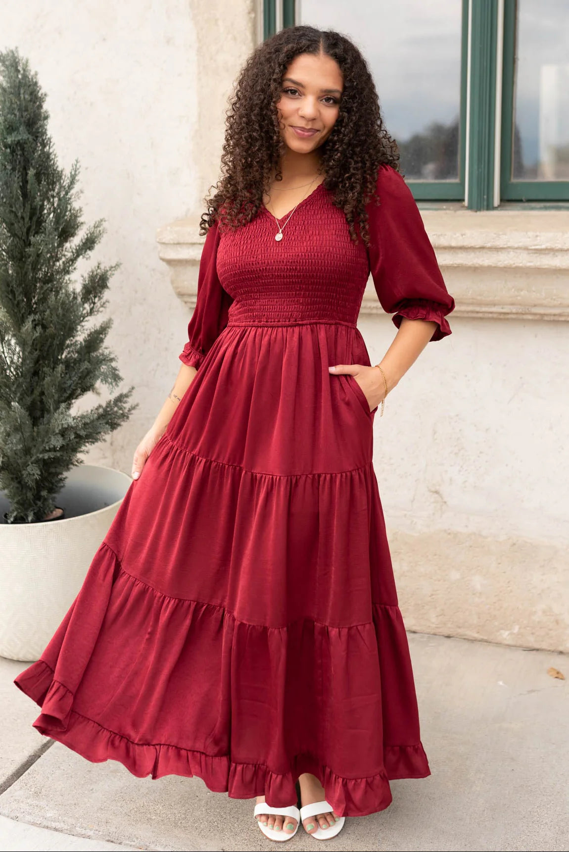 The Charlotte Dress is elegant, feminine, and exclusively ours. With a flattering smocked bodice and an easy elastic waist, it’s designed for both comfort and style. The deep wine hue gives it a rich, romantic look, while ruffle details on the sleeves and hem add the prettiest finishing touch. A tiered, partially lined skirt gives it flow and movement, and—of course—it has pockets!