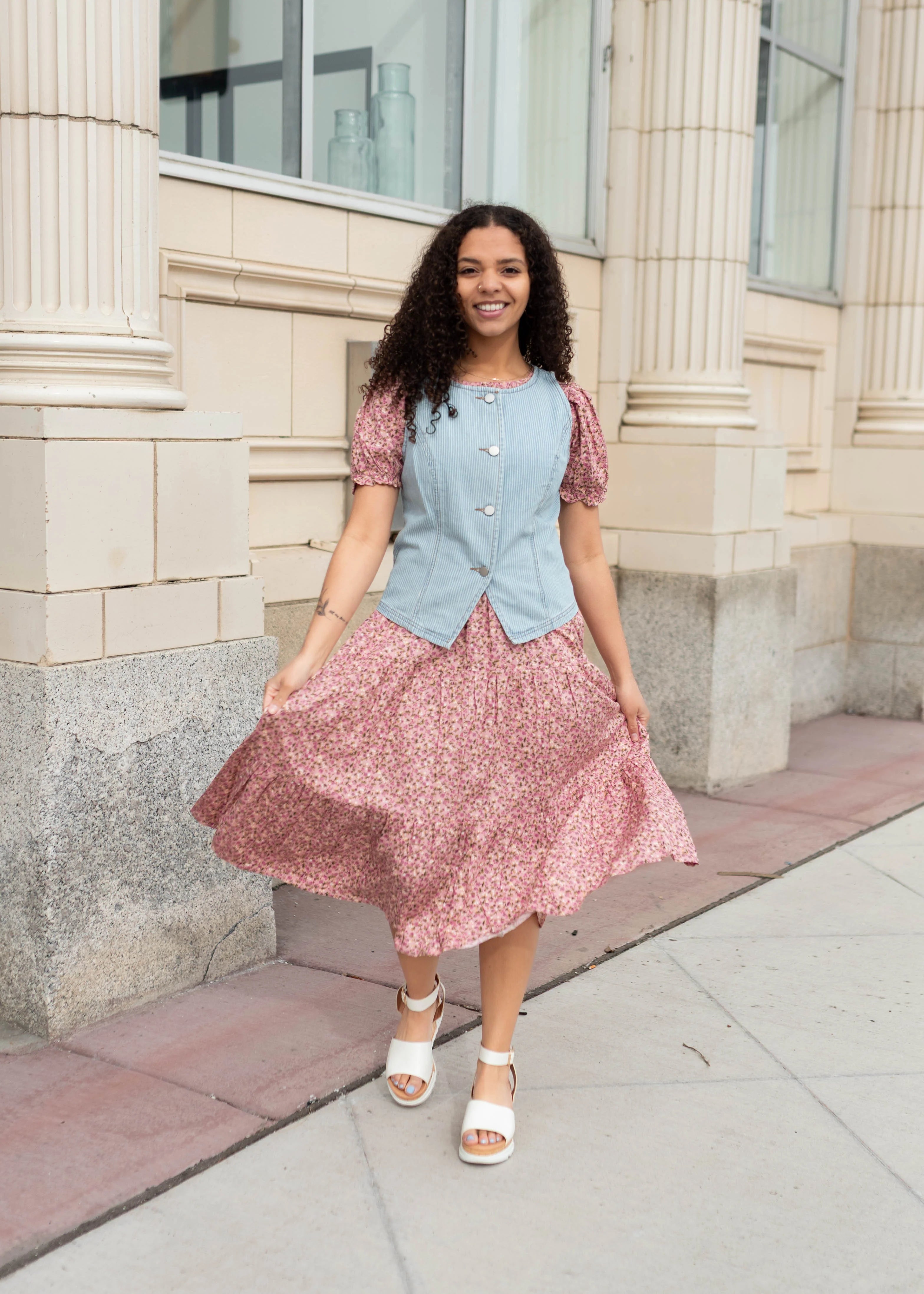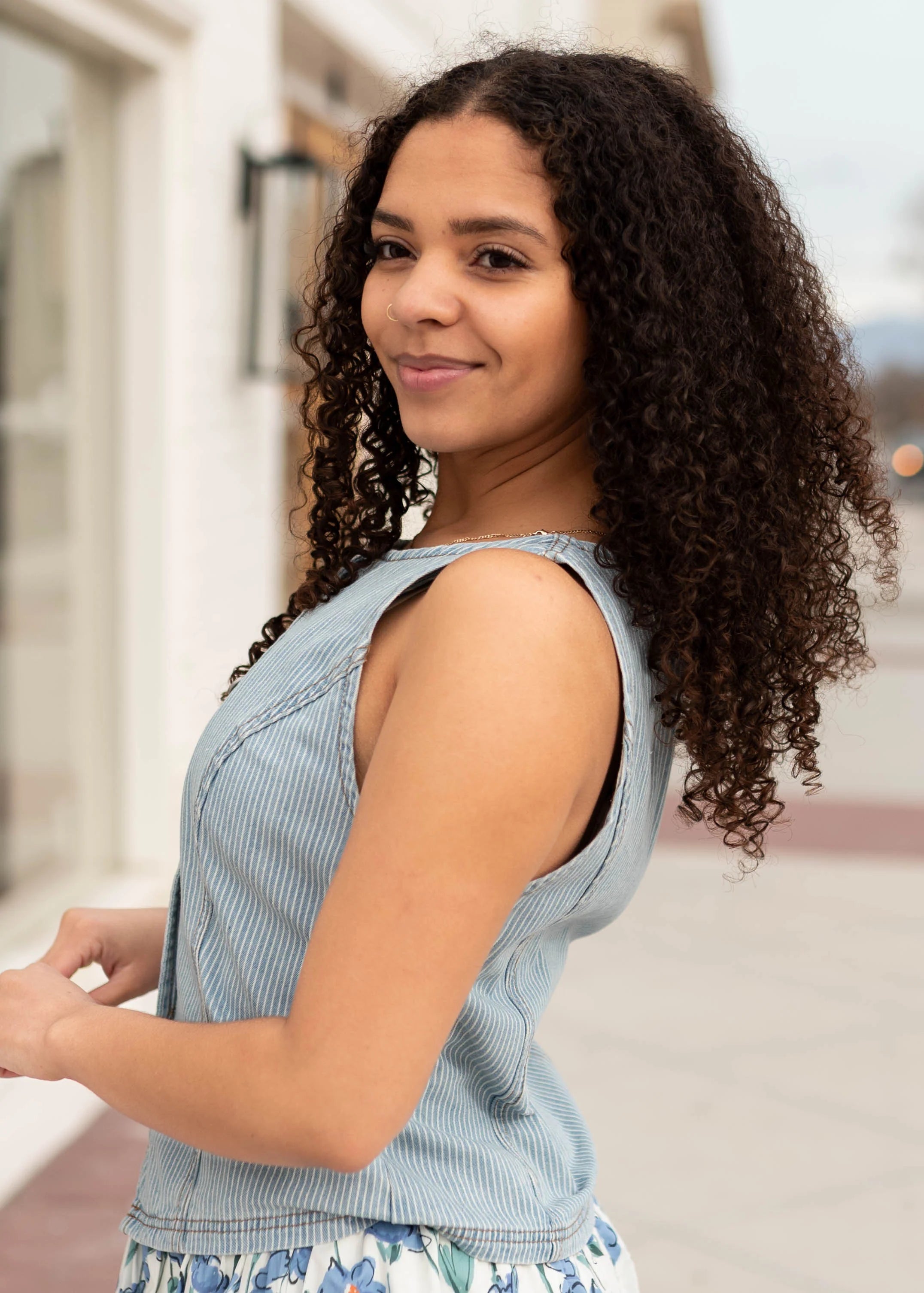 Structured, stylish, and easy to layer — the Chelsea Light Denim Pinstripe Vest is a fun piece that instantly elevates an outfit. Designed in a light denim wash with subtle white pinstripes, this vest features a flattering fitted silhouette with comfortable stretch that moves with you. The sleeveless design and classic crew neckline keep the look clean and polished, while the button-up front adds timeless detail. Wear it on its own or layered over your favorite tops for a look that feels both modern and versatile.