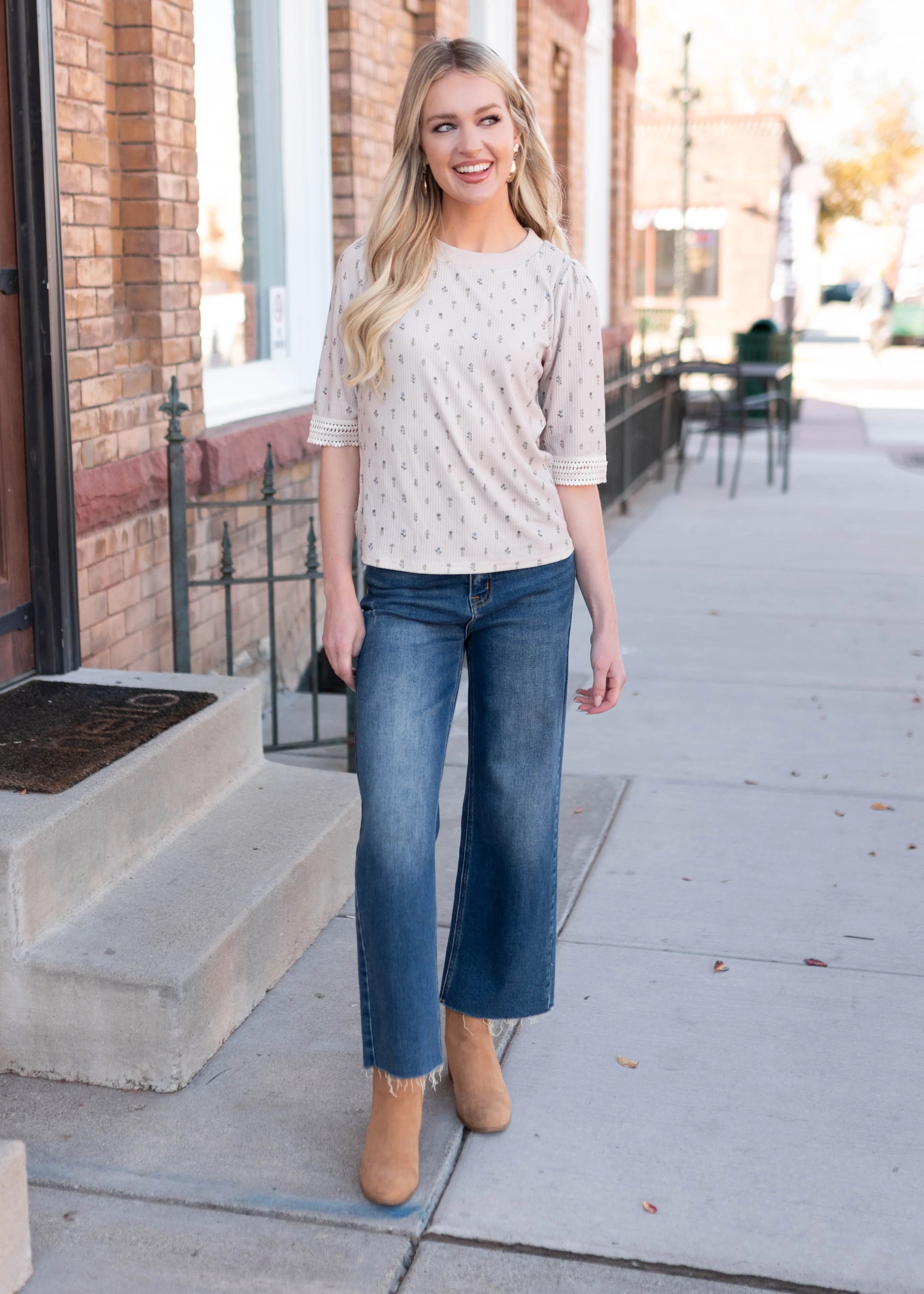 The Dahlia Top is soft, delicate, and effortlessly pretty. Made with a ribbed cream fabric and a dainty floral print, it’s the perfect blend of comfort and femininity. Lace detailing on the sleeves adds a lovely touch, while the relaxed fit and stretch make it easy to wear on its own or layered under your favorite sweaters and jackets.