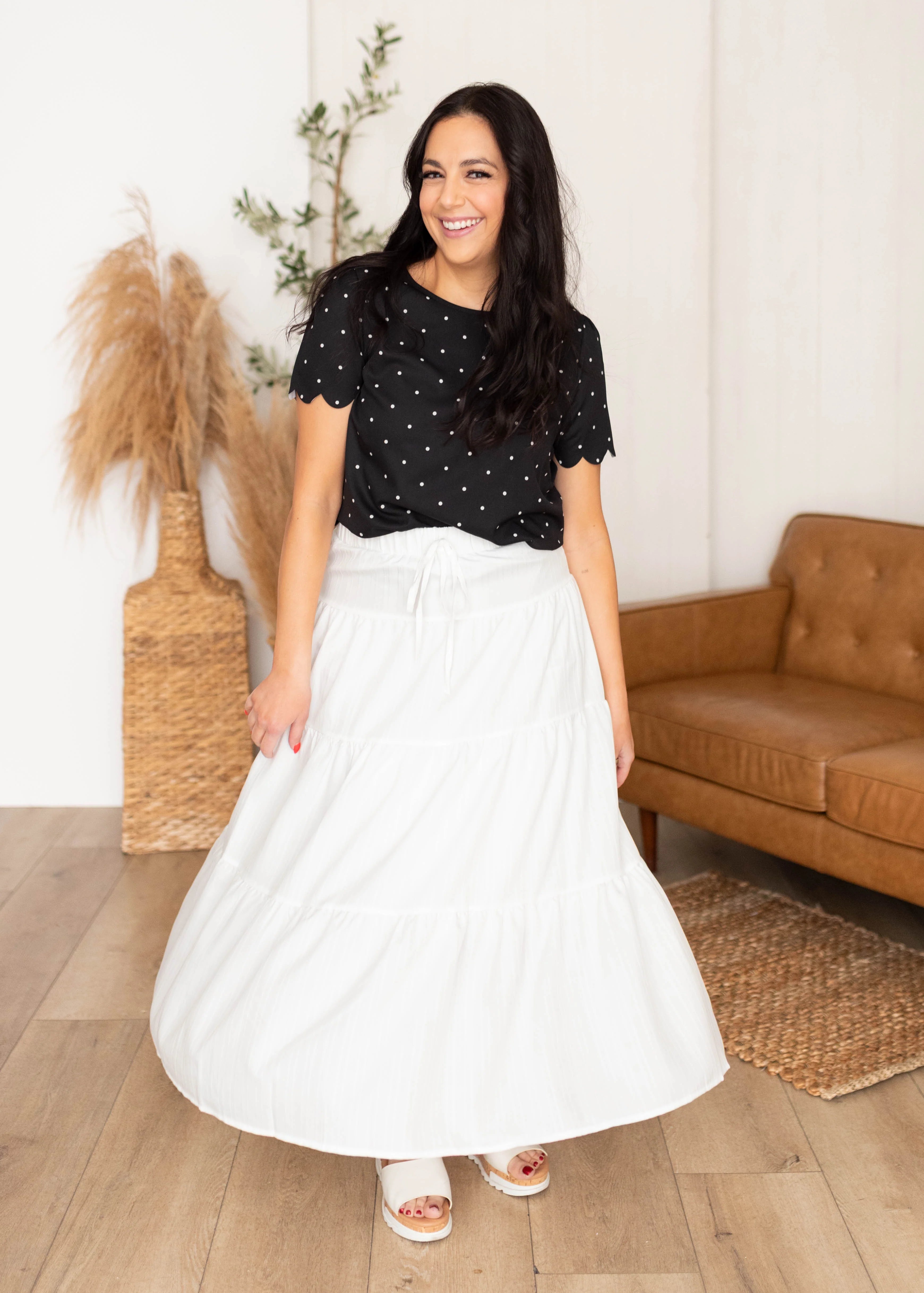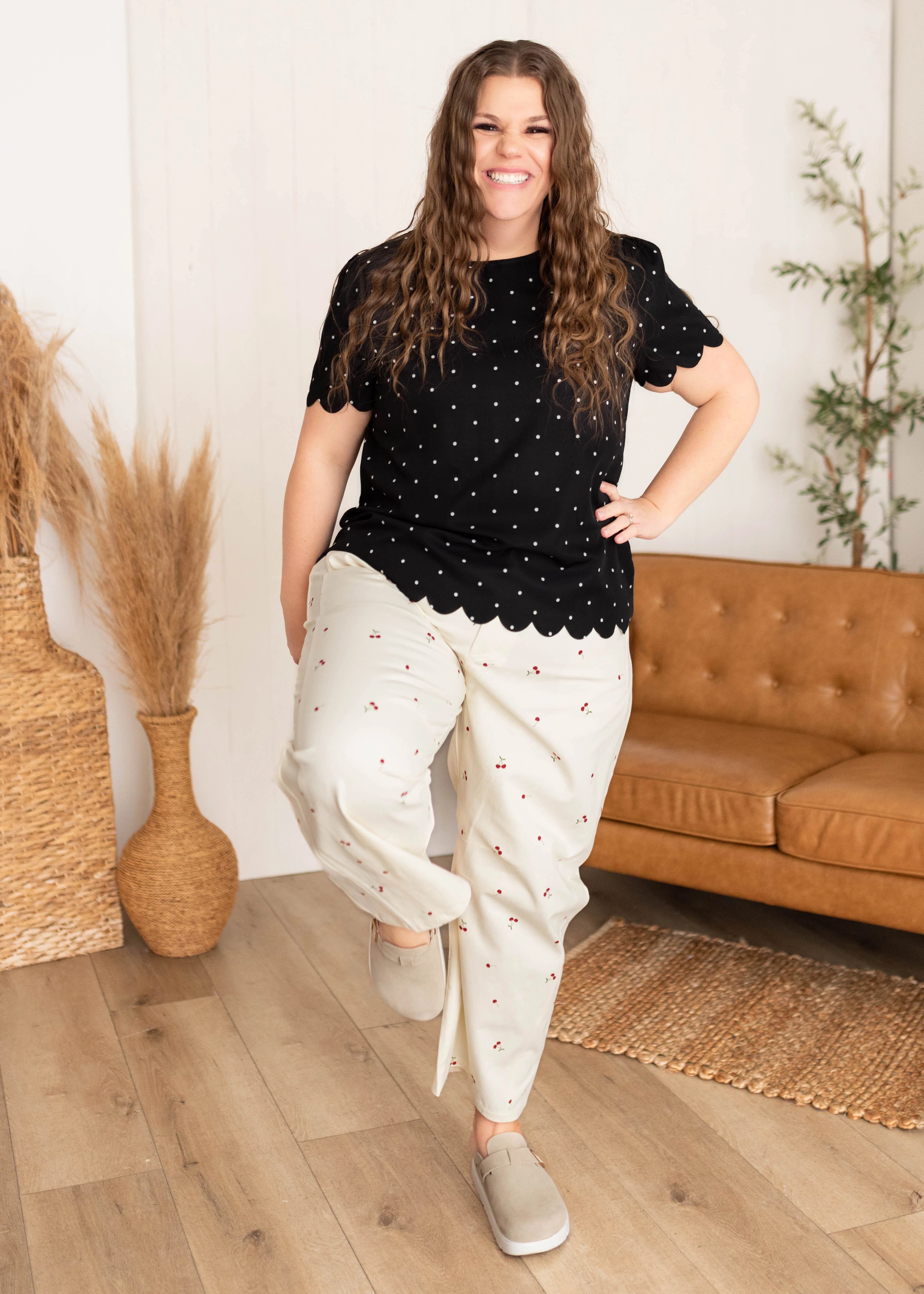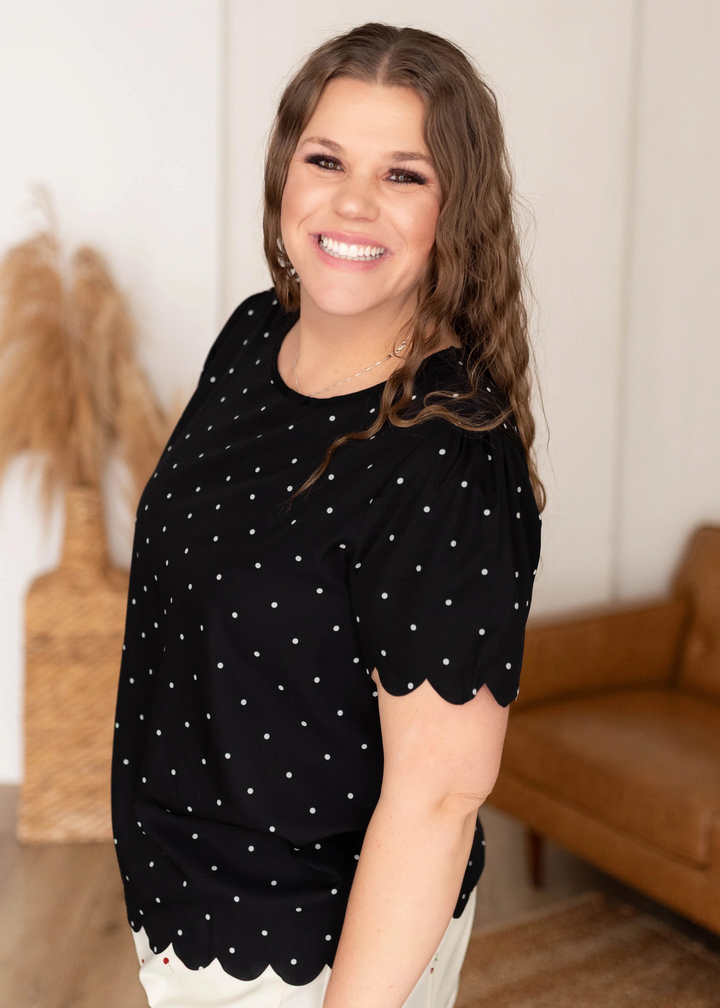 The Daniella Black Polka Dot Top is a classic piece you’ll wear season after season. Featuring a black base with white polka dots, this lightweight and breathable top has a relaxed fit and delicate scalloped trim for a feminine touch.