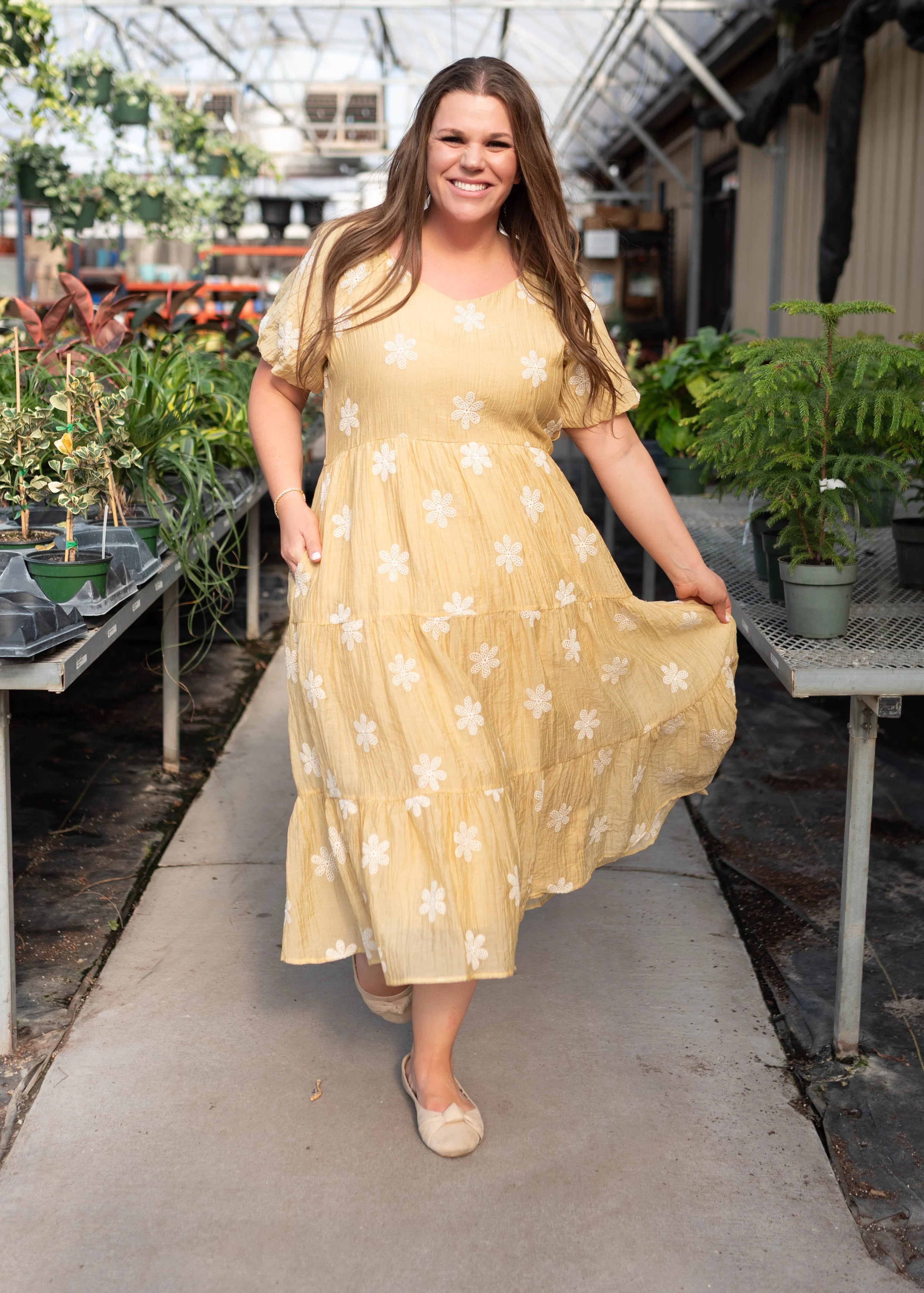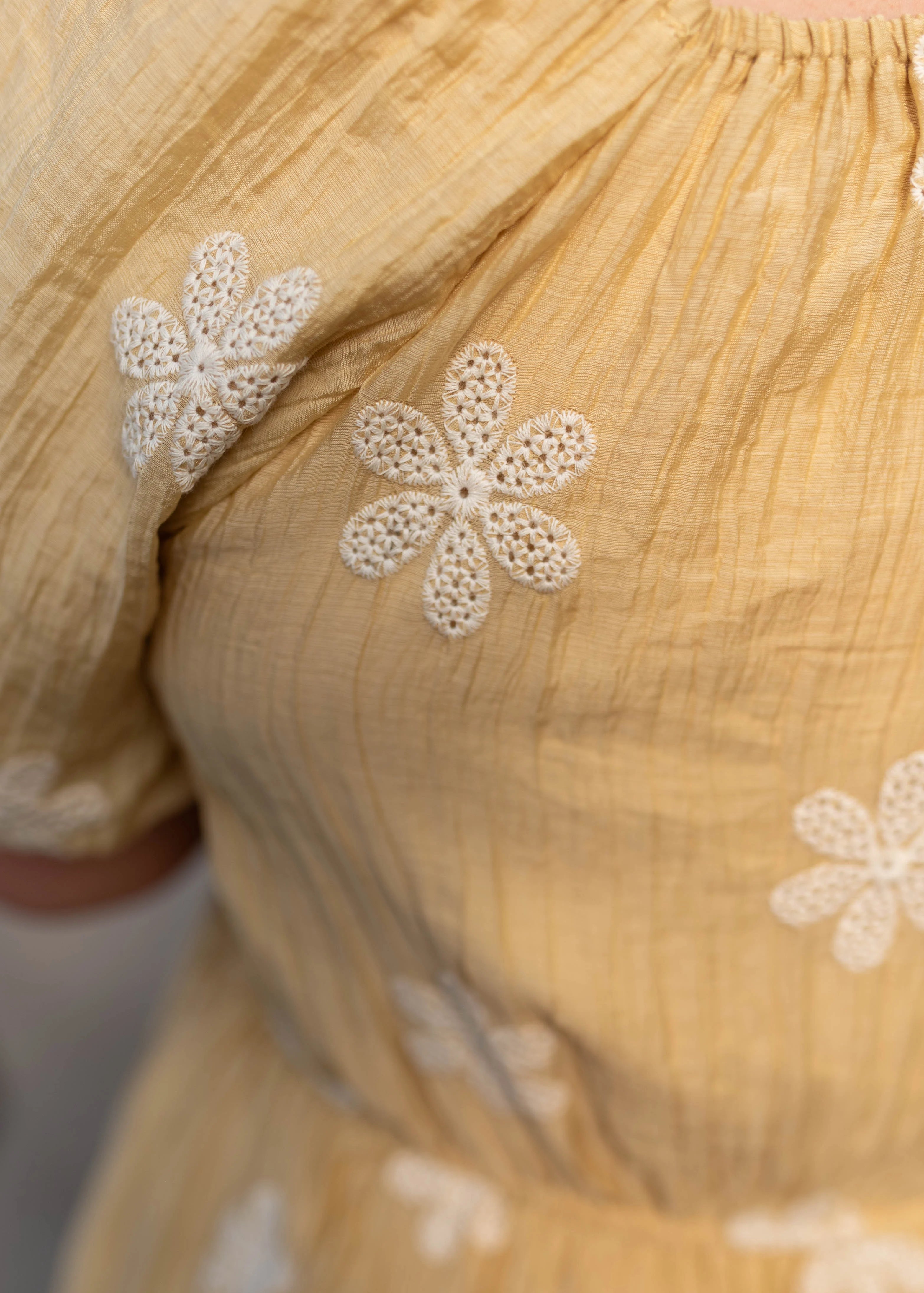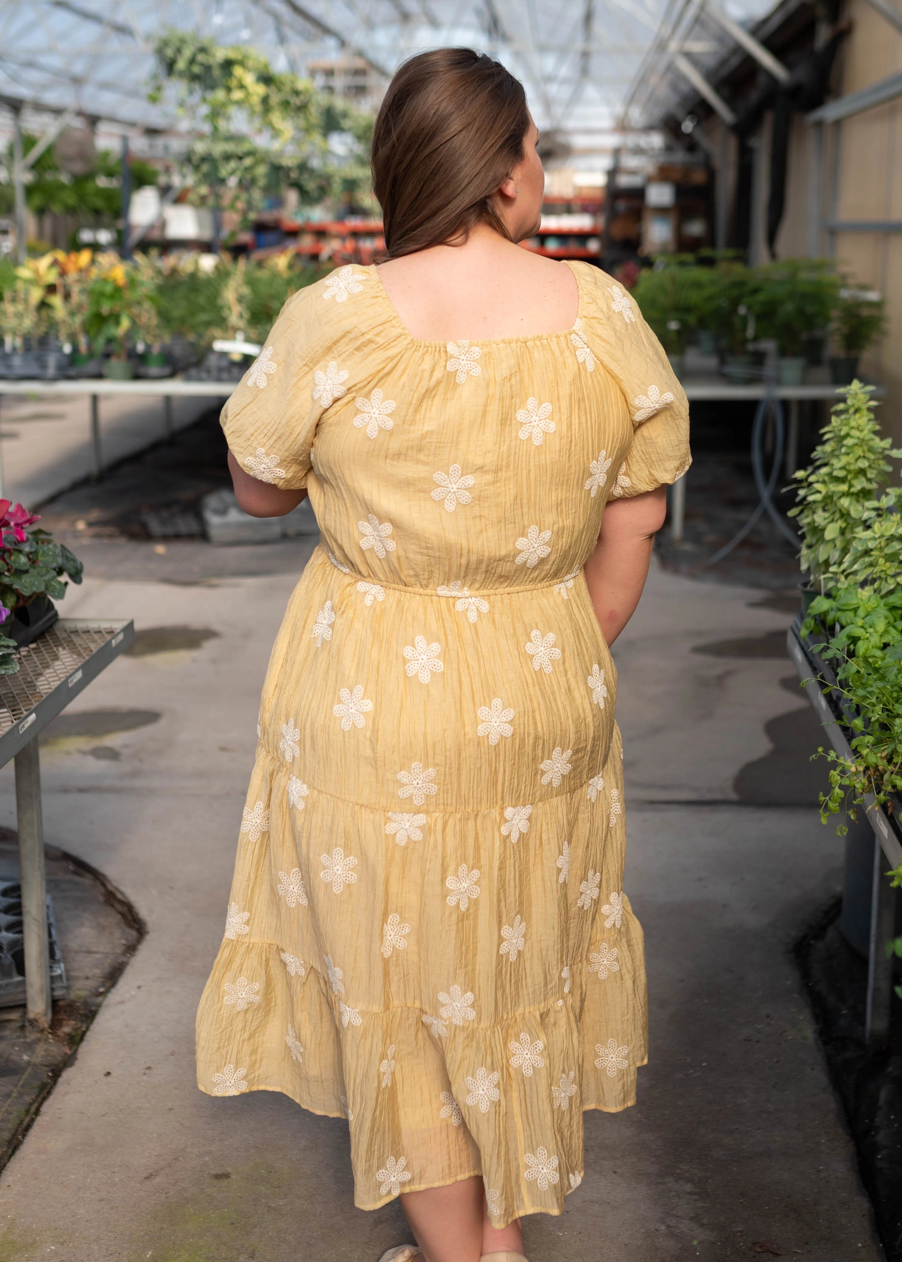 The Jayla Yellow Embroidered Dress is a dreamy, feel-good style made for bright days and happy plans. Featuring a soft yellow textured fabric with delicate white floral embroidery throughout, this dress has a flattering square neckline, puff sleeves, and a comfy elastic waist. The tiered skirt adds flow and movement, while functional pockets and a full lining make it as practical as it is pretty.