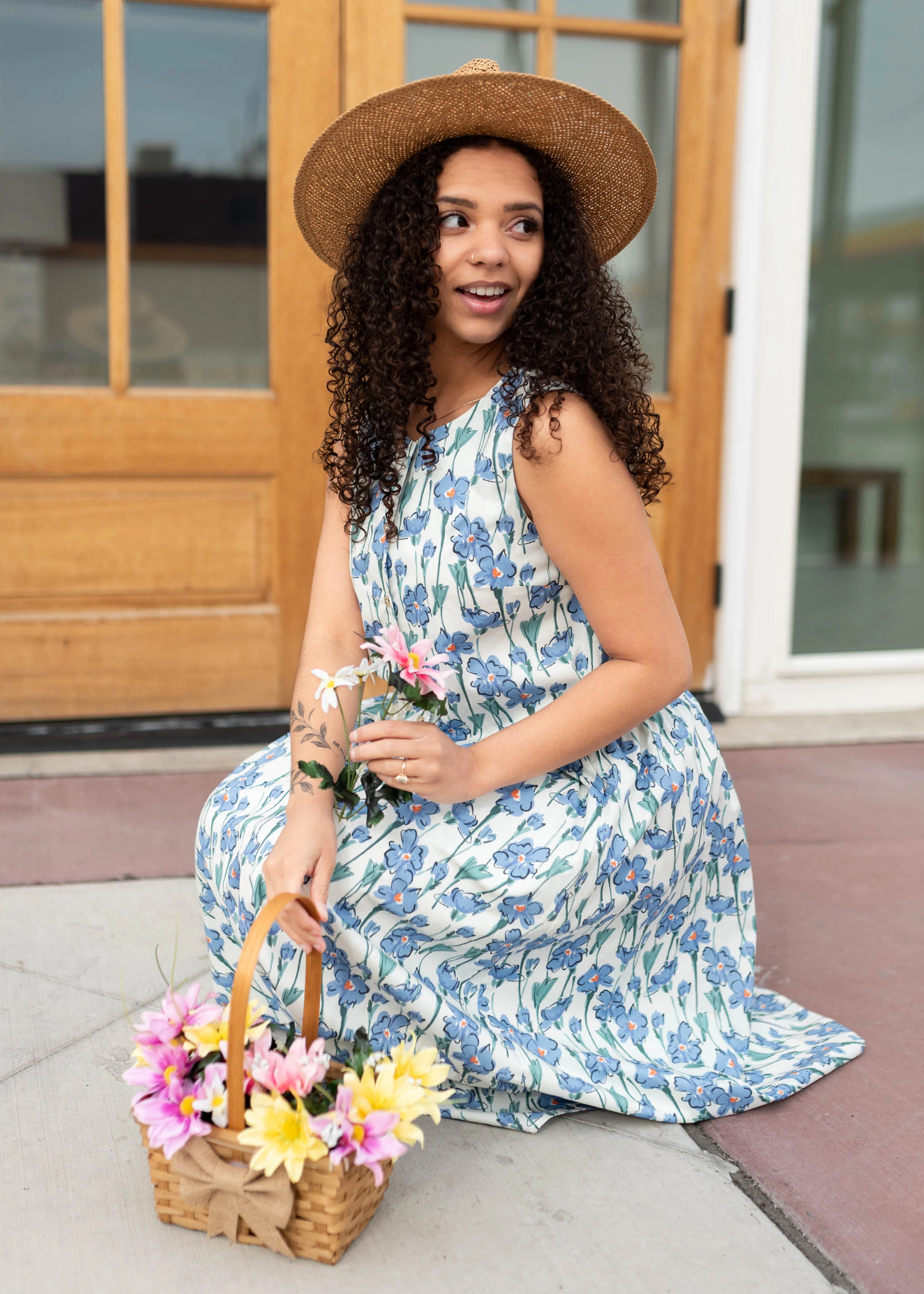 Fresh, feminine, and easy to style — the Kenna Blue Floral Sleeveless Top is the perfect piece for creating a beautifully coordinated look or mixing into your everyday outfits. Designed with a soft cream base and a delicate blue floral print, this top features a relaxed boxy fit with a slightly cropped length that pairs perfectly with high-waisted skirts or denim. The thick straps provide comfortable coverage, while the button-up front and classic crew neckline keep the look polished and timeless. Fully lined for easy wear, it’s a versatile piece you’ll love styling multiple ways.