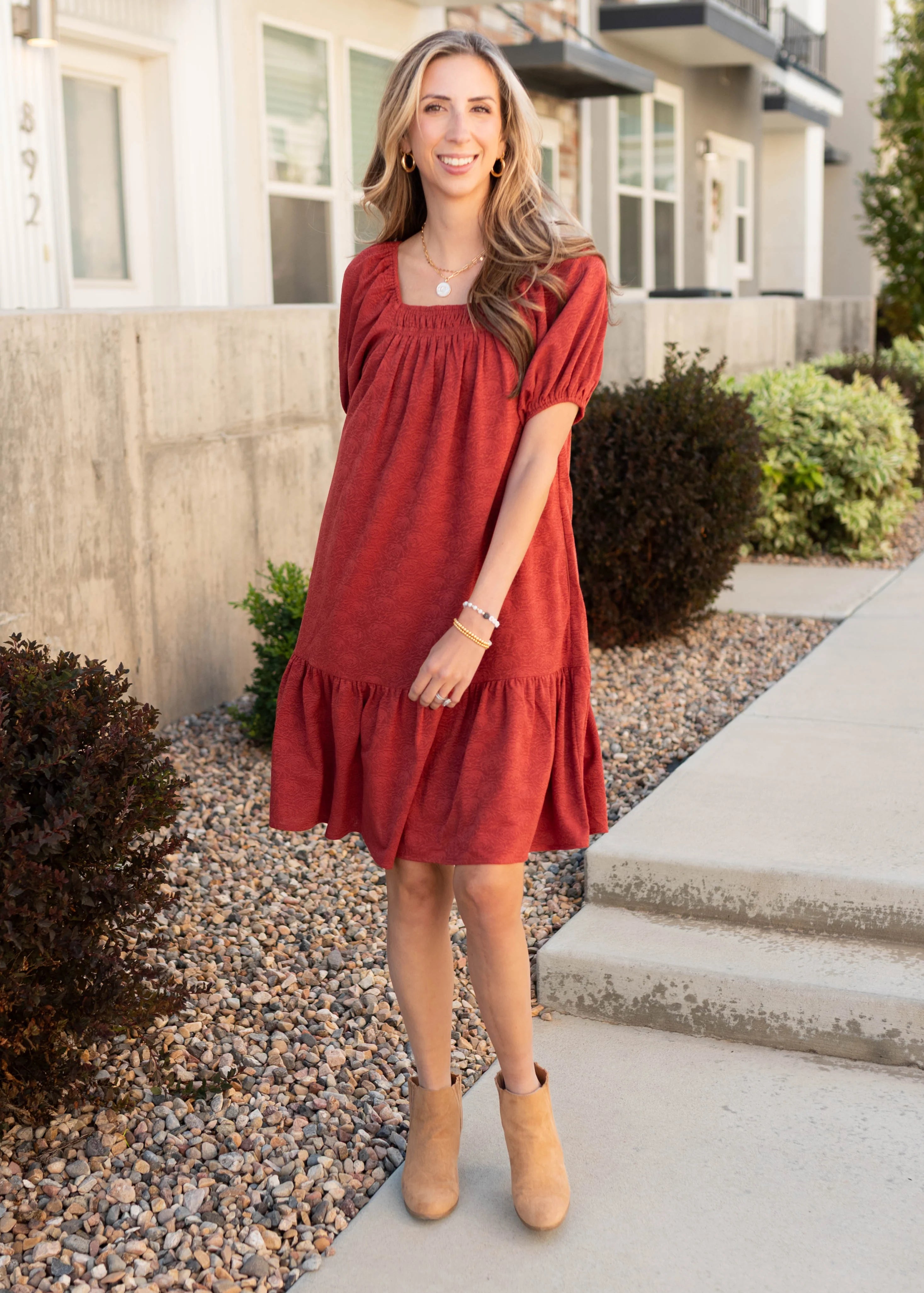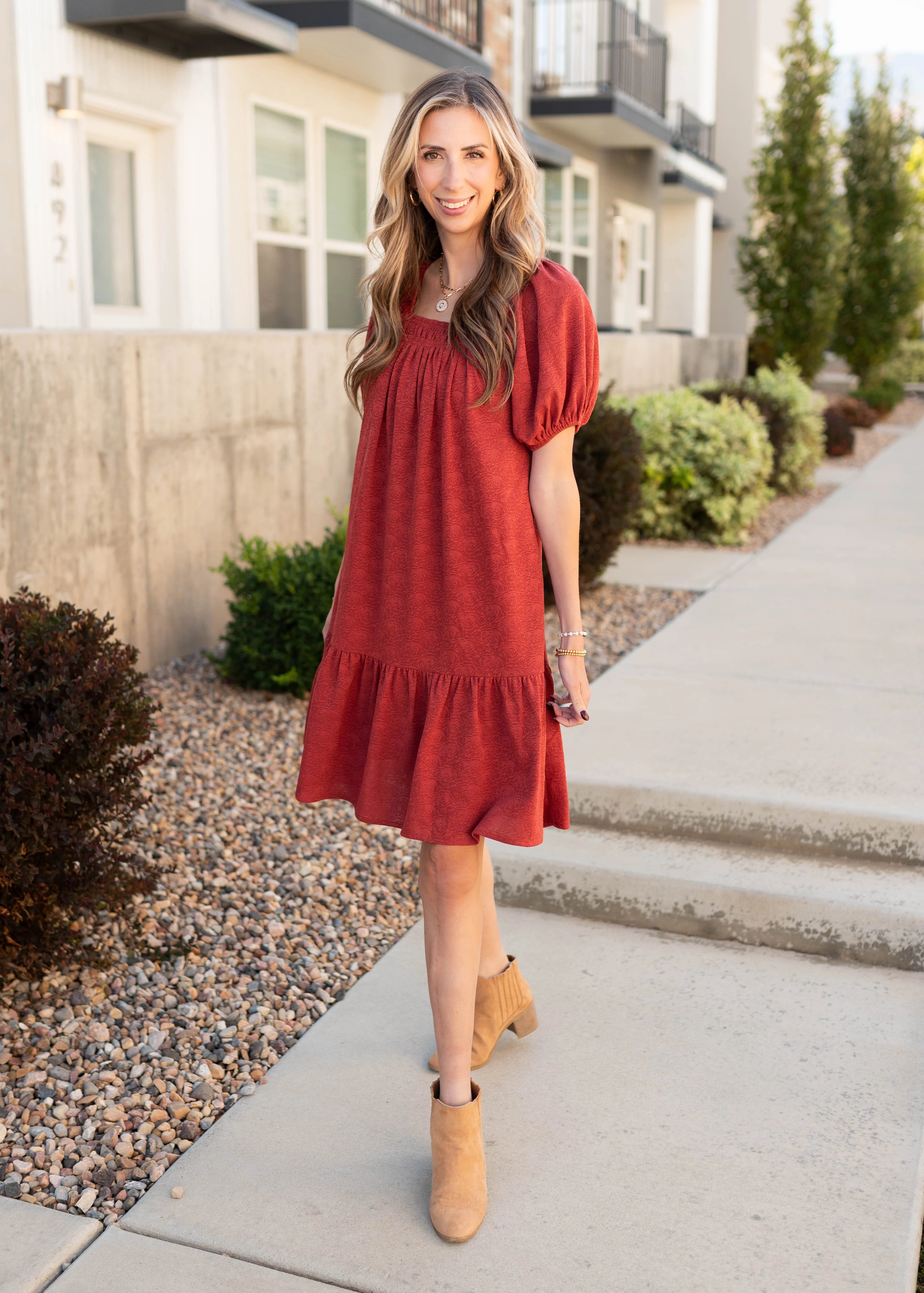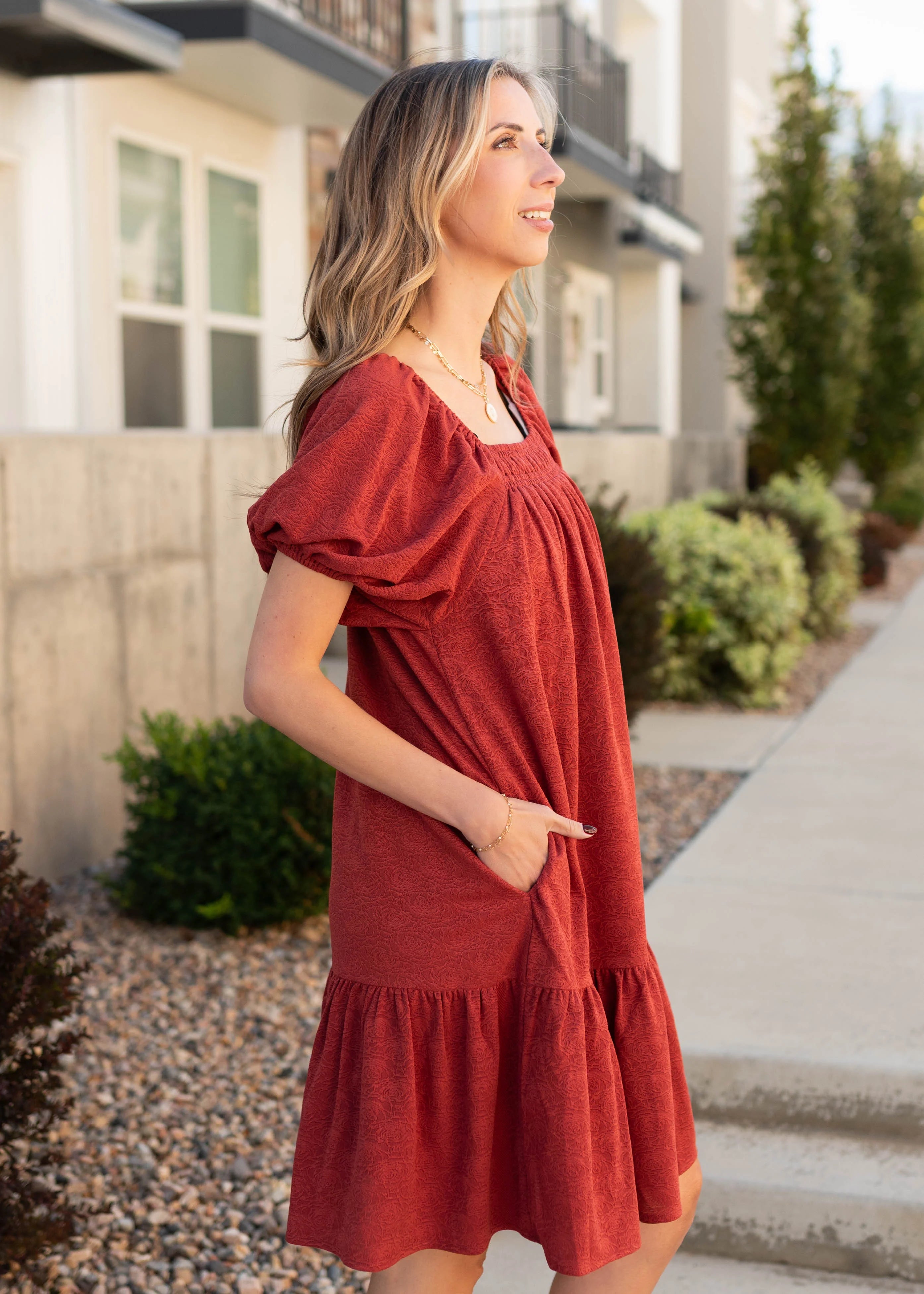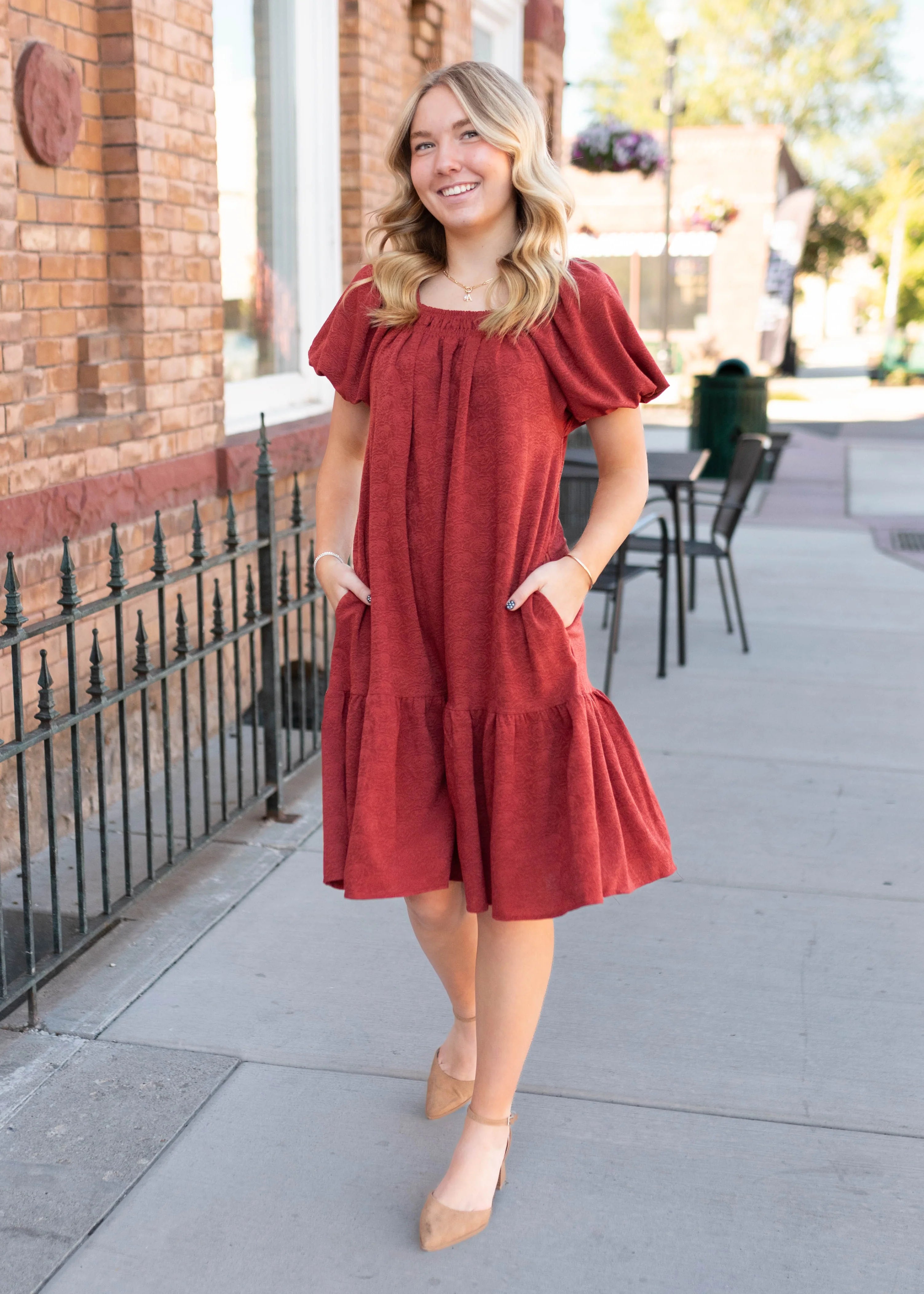 Meet the Leyla Dress—our exclusive design that’s all about effortless charm! Featuring a rich rust floral print, square neckline, and puff sleeves, this dress blends sweet details with a comfortable fit. Elastic at the sleeves and neckline makes it easy to wear, while a single tier and fully lined skirt keep it flowy and polished. Functional side pockets add practicality to this pretty, versatile piece.