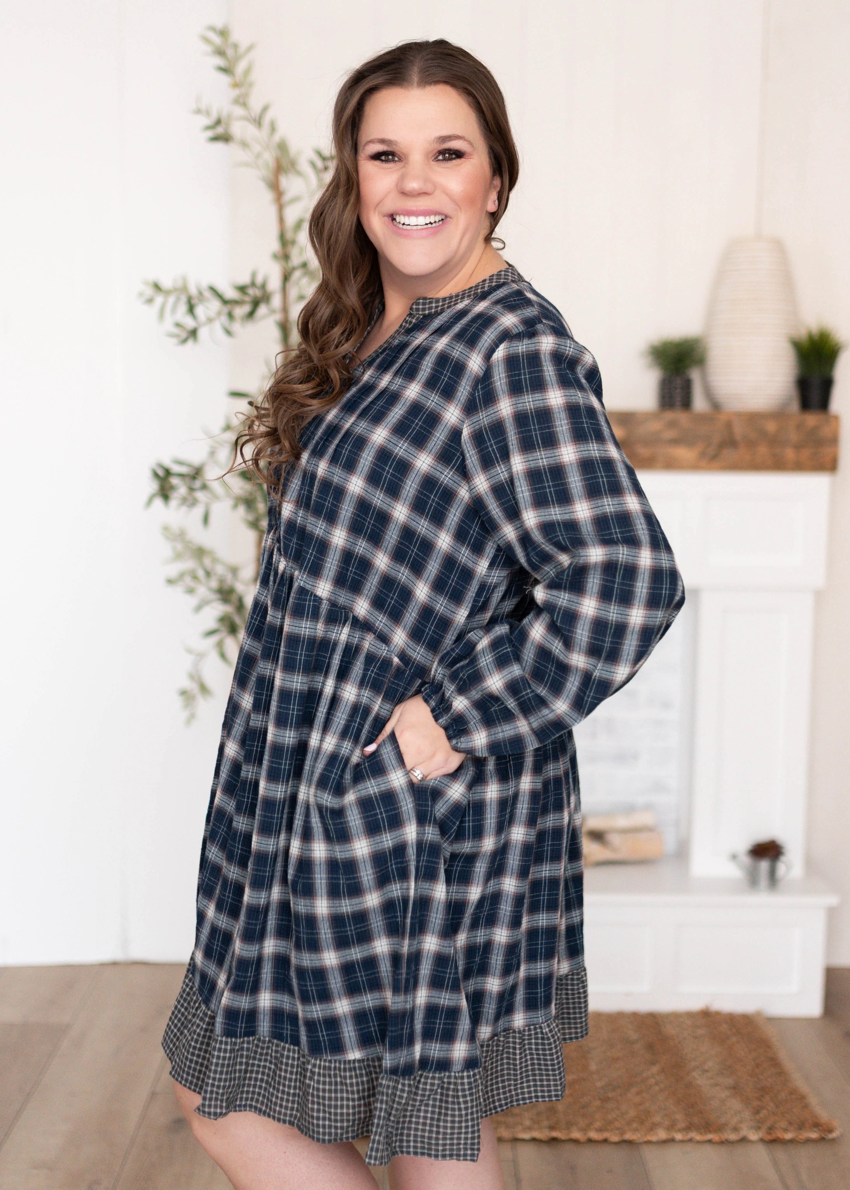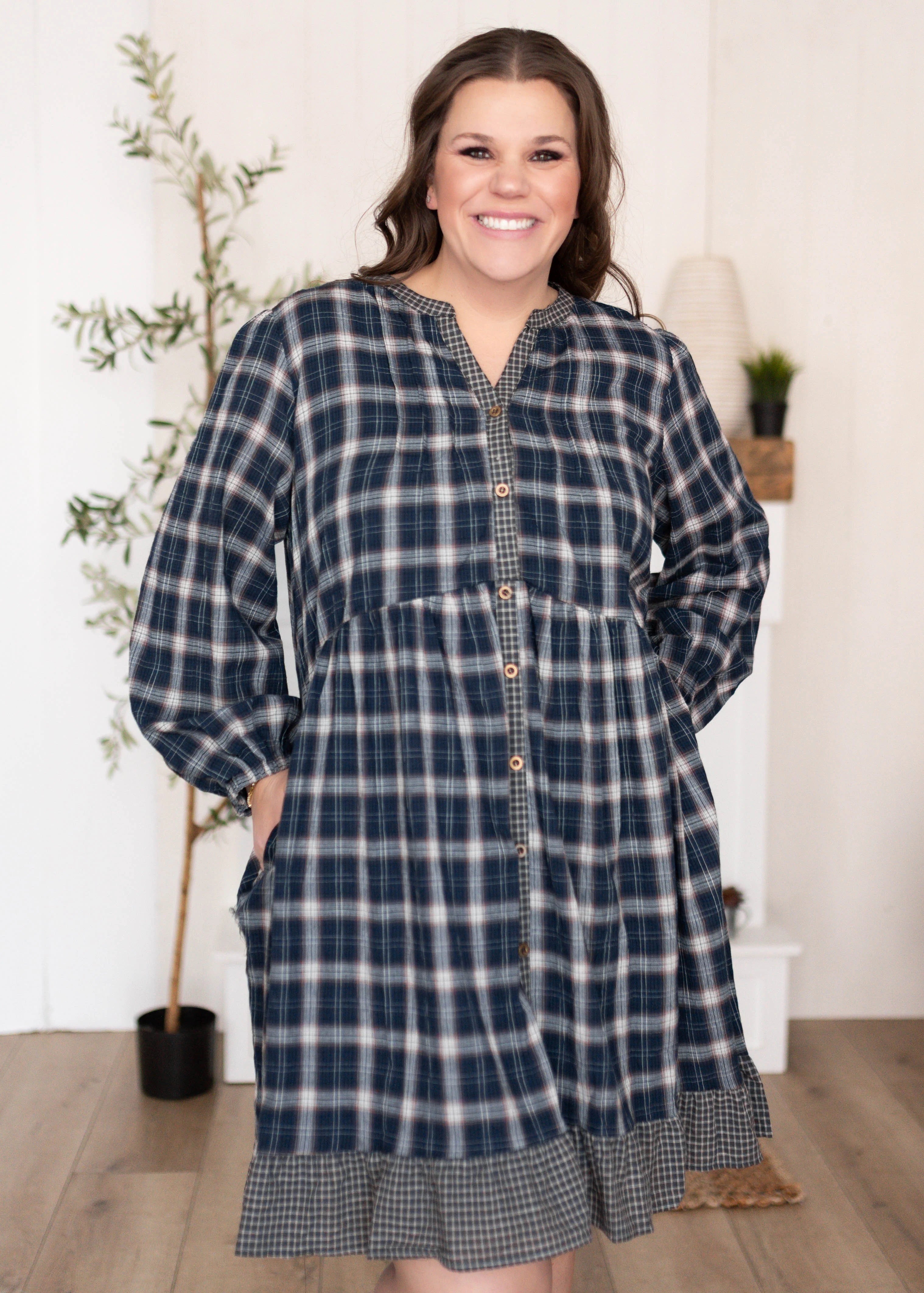 The Madilyn Dress is all about charm with a little extra fun! Designed in a mix of mis-matched gingham prints, this navy plaid dress is as unique as it is stylish. The functional front buttons make it nursing-friendly, while the v-neckline and elastic sleeves keep it flattering and comfortable. A fully lined skirt and functional side pockets make it as practical as it is pretty—you’ll be reaching for this one on repeat.