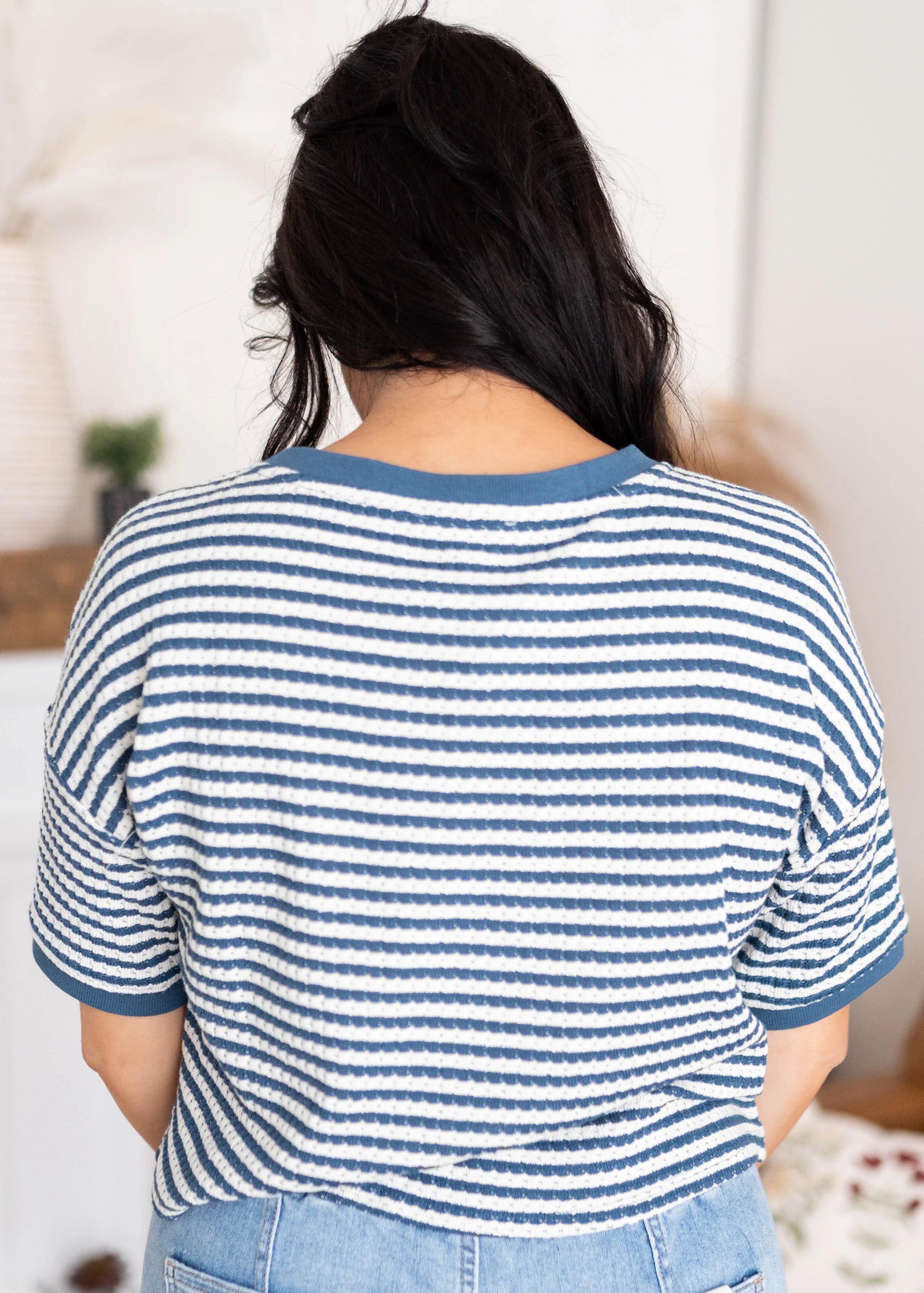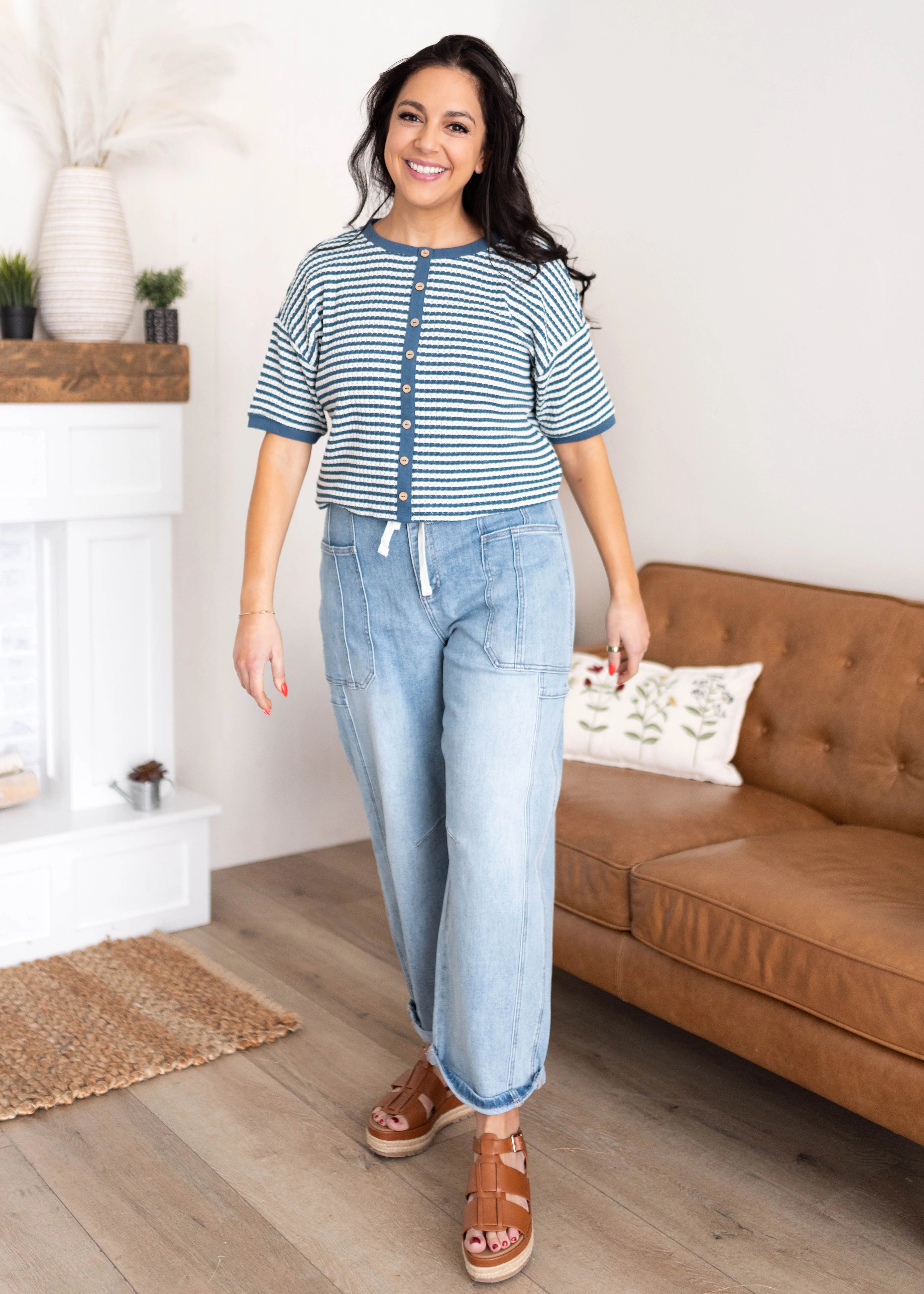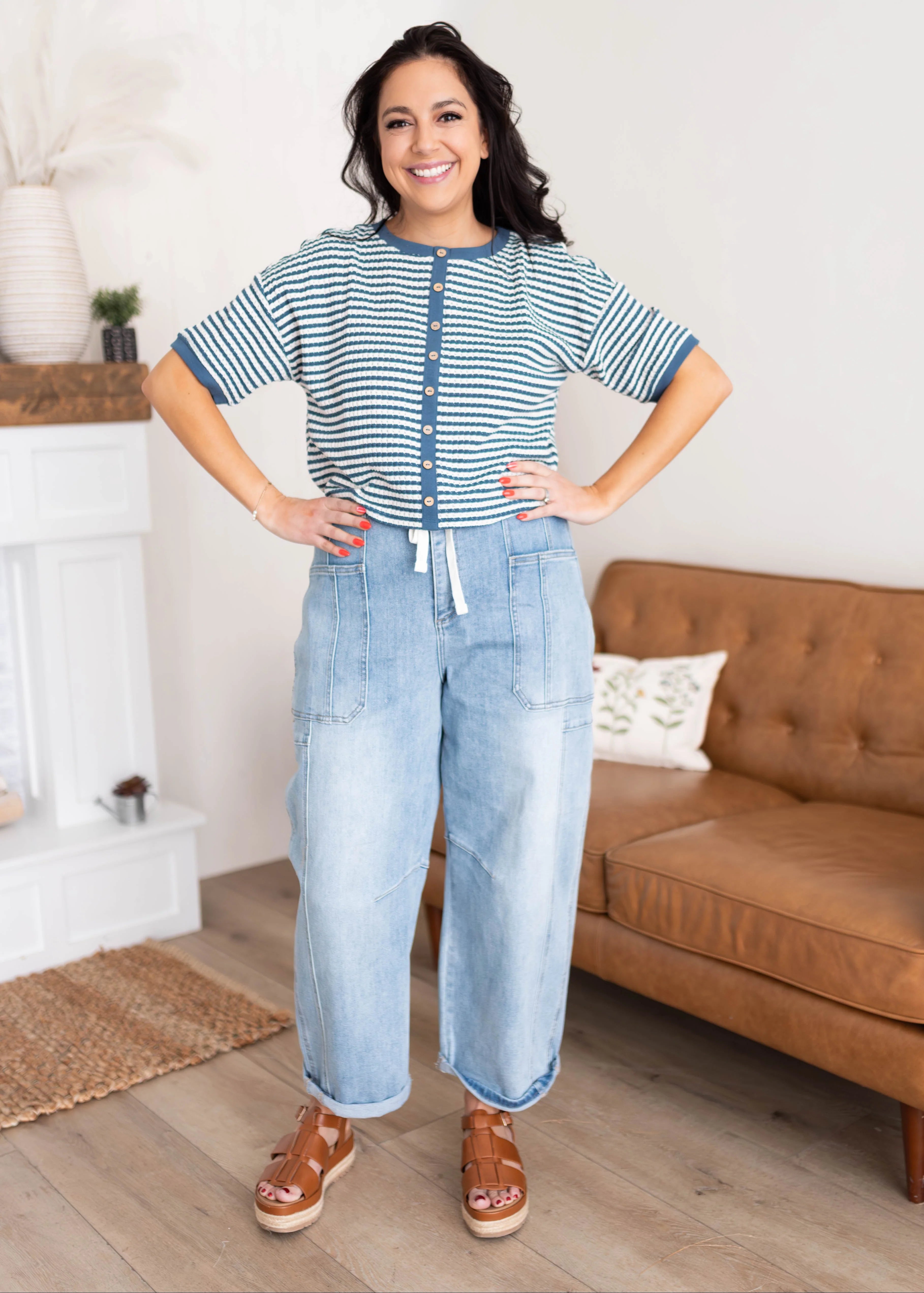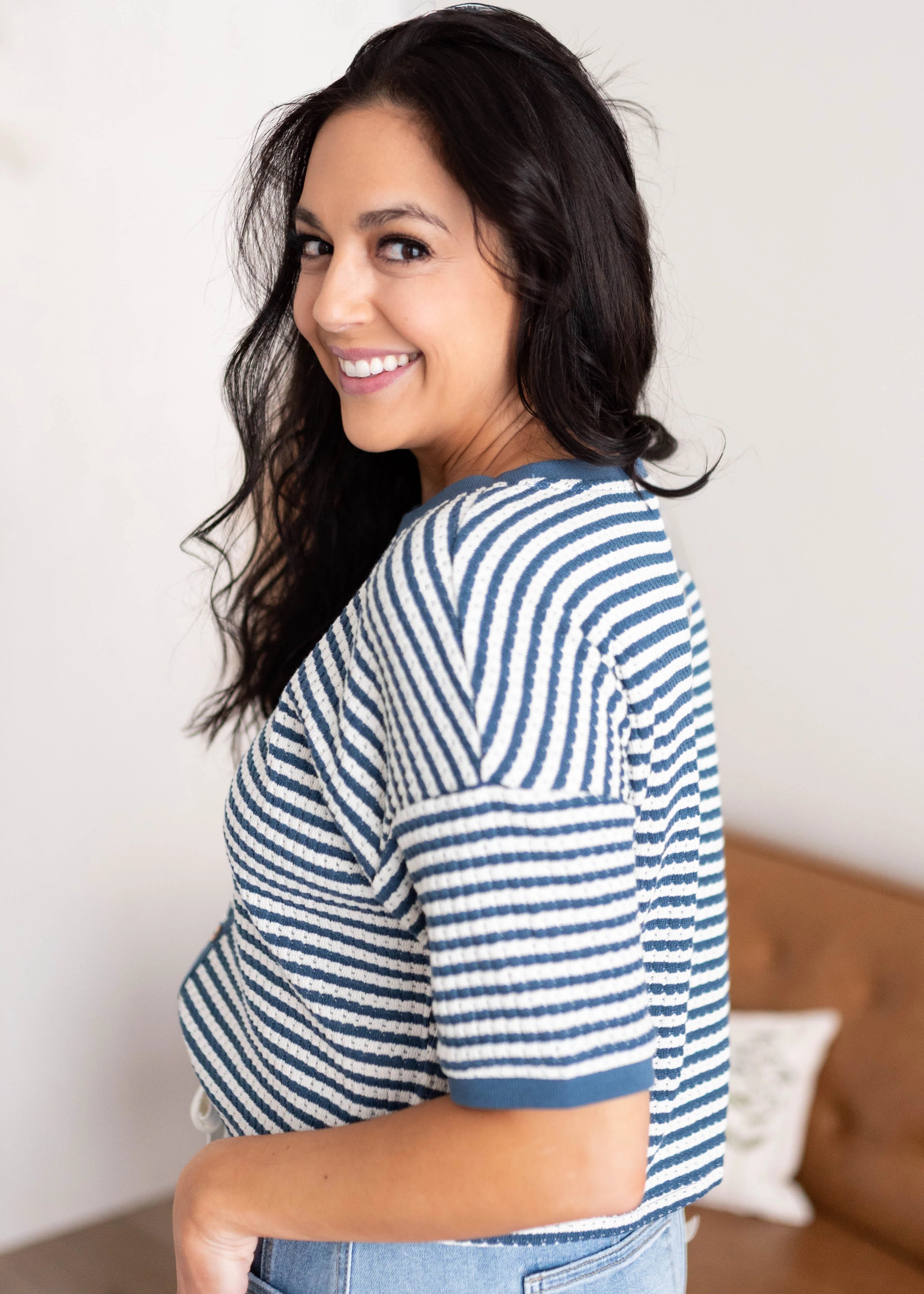 The Nila Blue Stripe Cardigan is a fun layer with a classic feel. Designed with blue and white stripes and a soft knit fabric, this cardigan adds an easy pop of color to any outfit. The faux button front gives it a polished look while keeping it comfortable and effortless to wear.