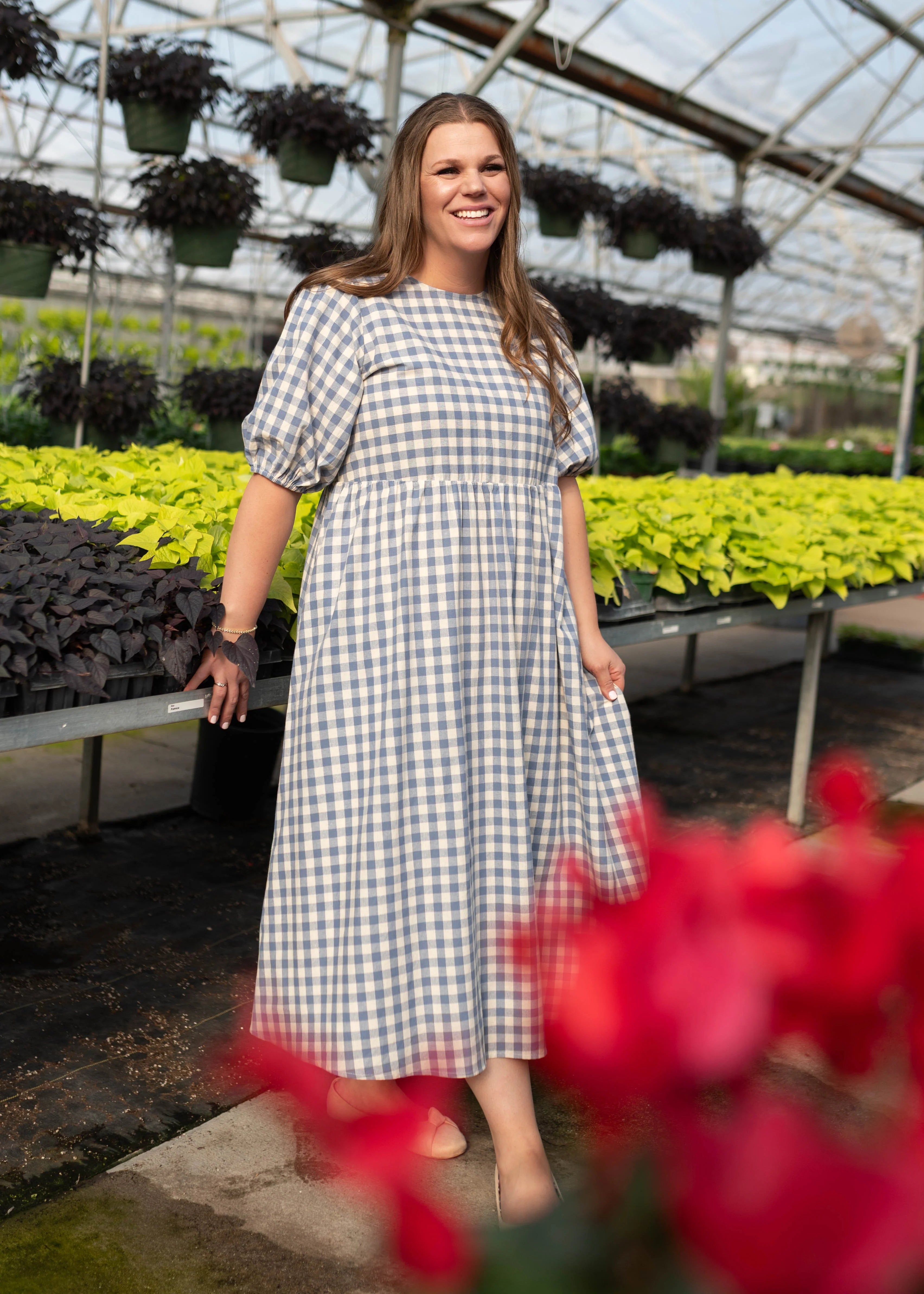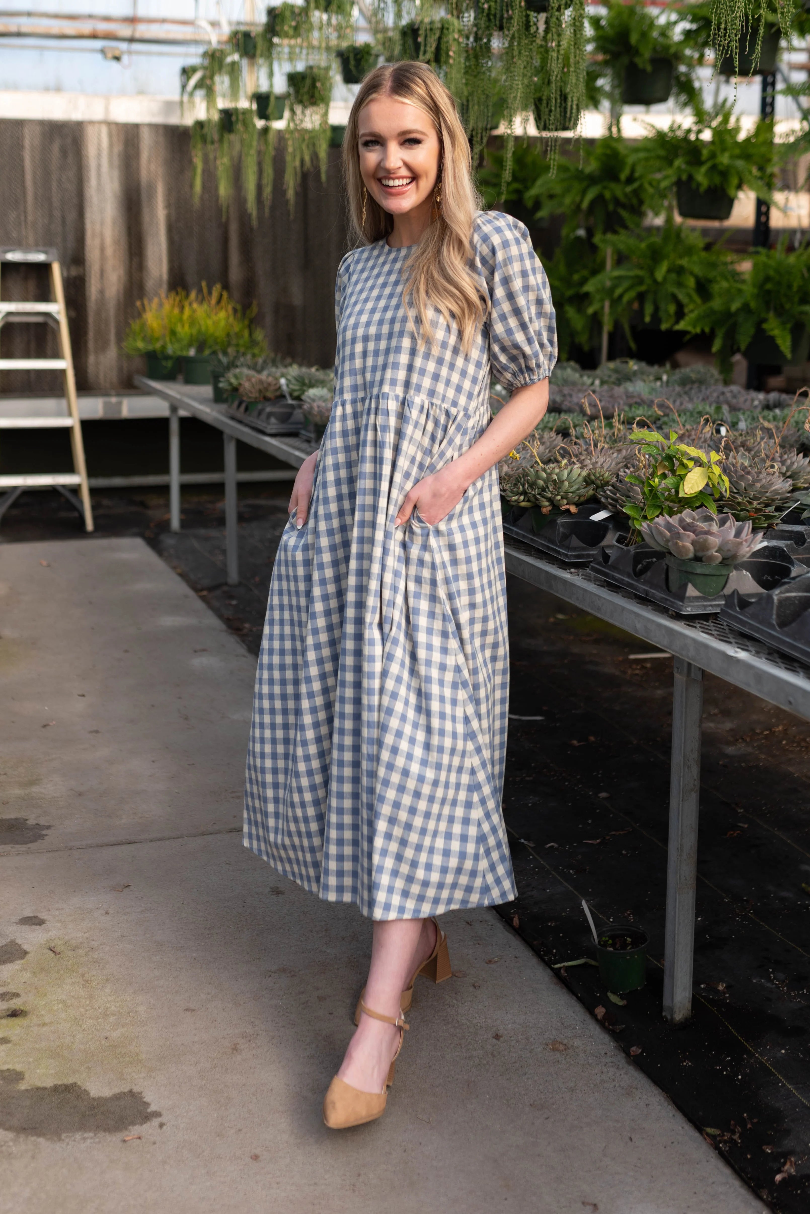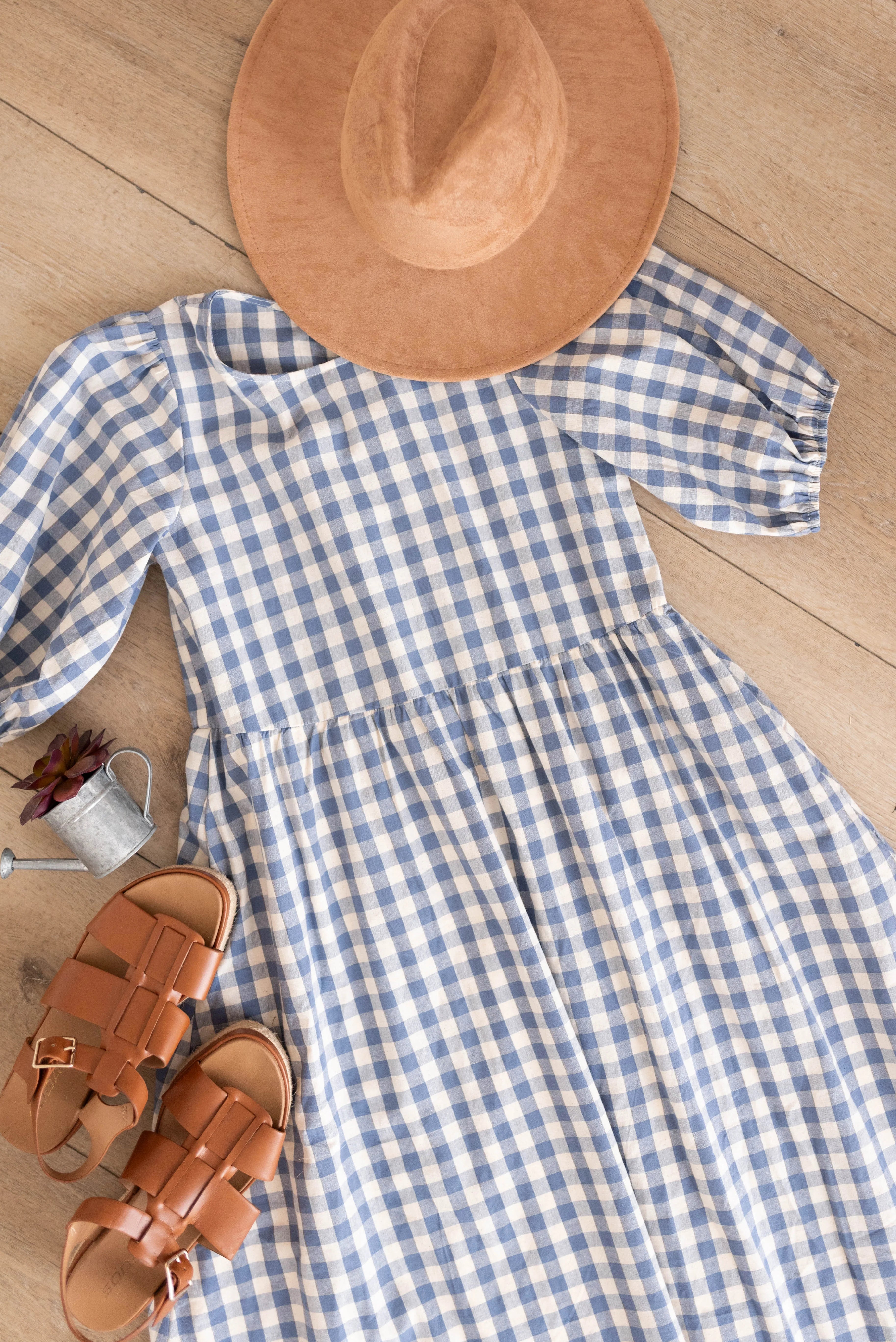 Sweet, breezy, and made for sunny days. The Rachel Blue Gingham Dress is a charming, easy-to-wear style with a relaxed babydoll silhouette you’ll love. Featuring a soft blue and white gingham print, this dress has a flattering scoop neckline, puff sleeves, and a keyhole button closure on the back for a delicate touch. Fully lined with functional pockets, it’s as practical as it is cute.
