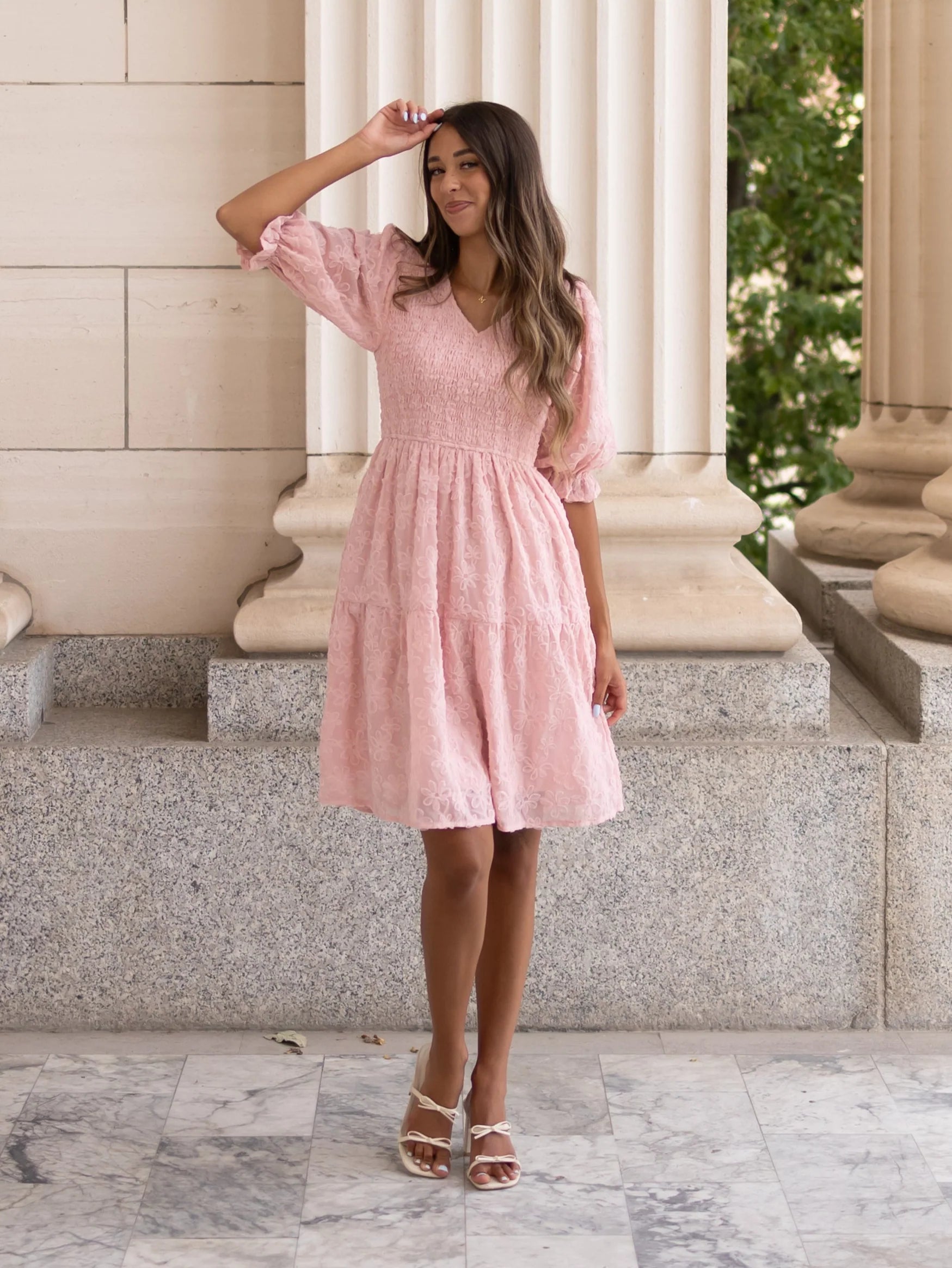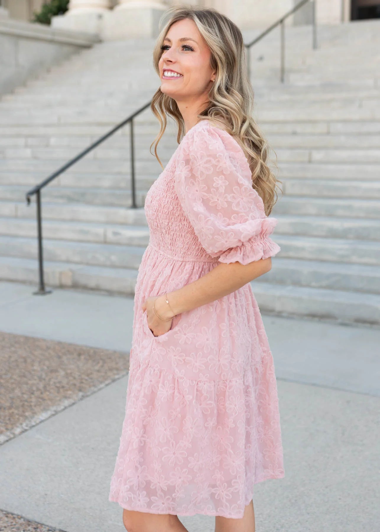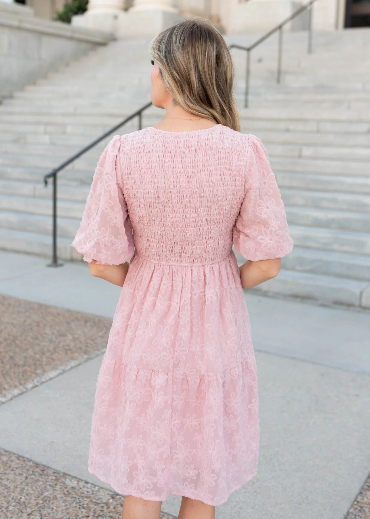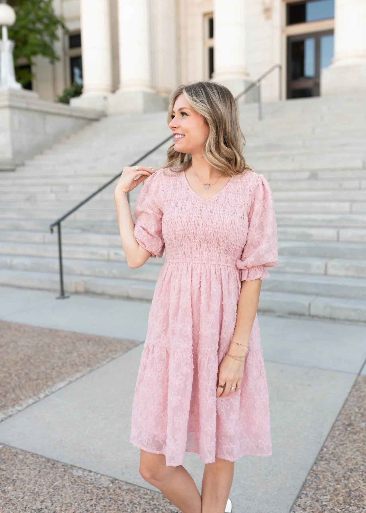 Romantic and effortlessly flattering, the Robin Dress is designed with soft blush pink textured fabric and dainty floral details. A smocked bodice adds all-day comfort and shape, while the flowy skirt and short sleeves keep it breezy and beautiful.