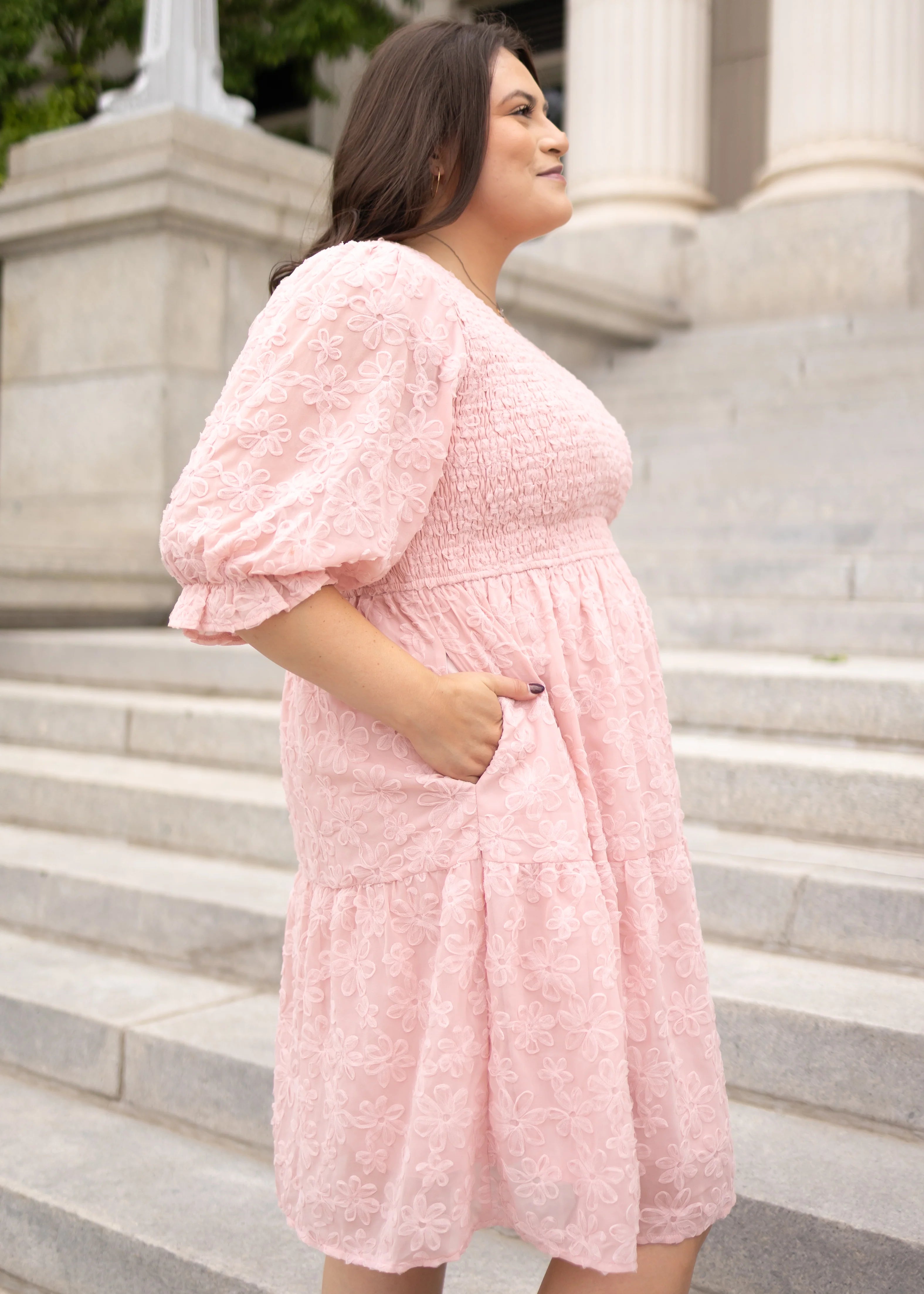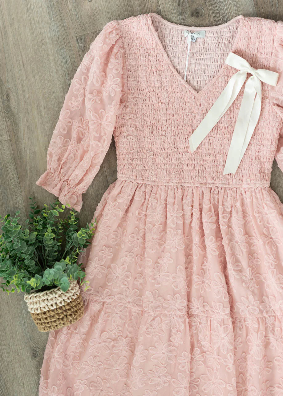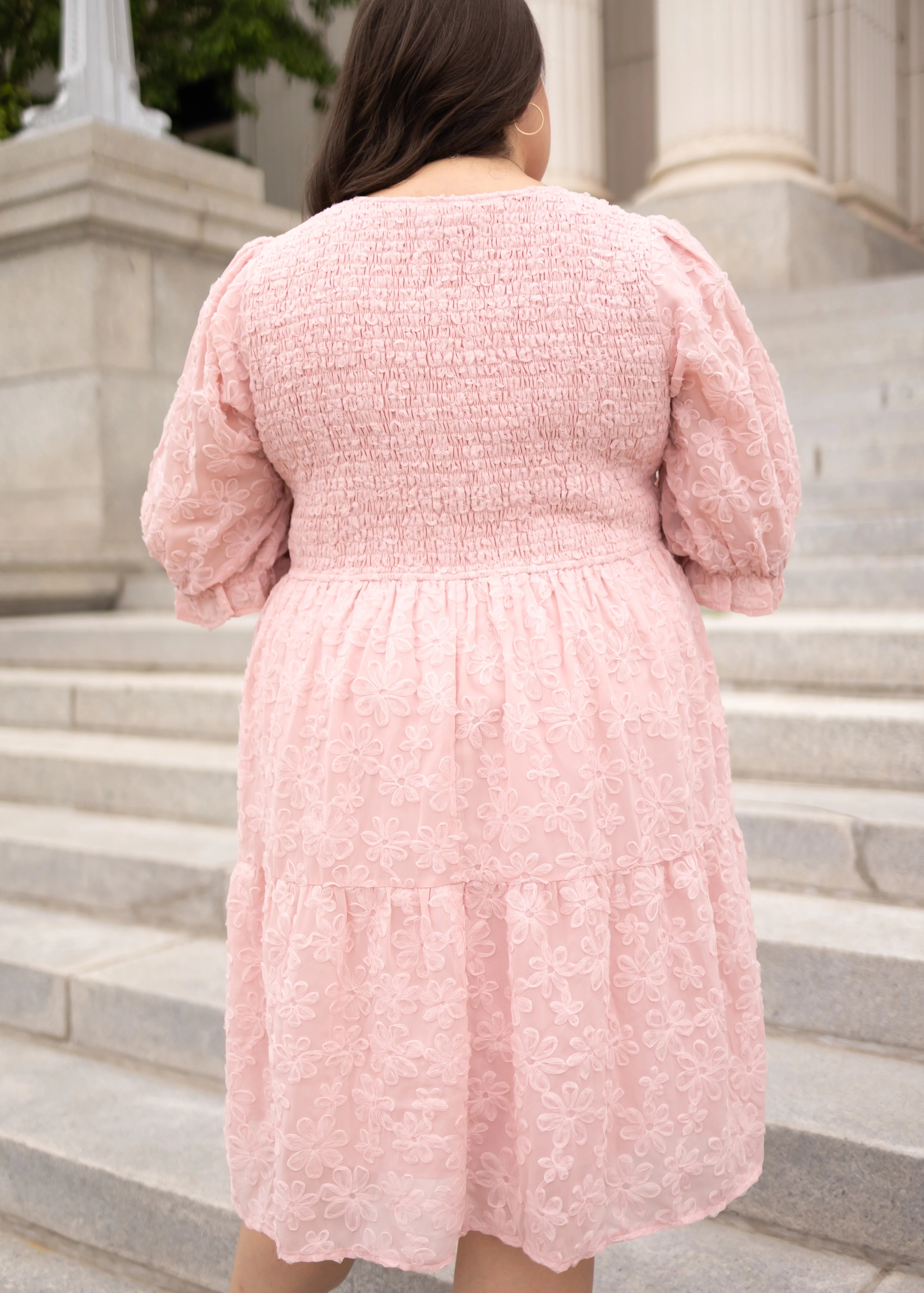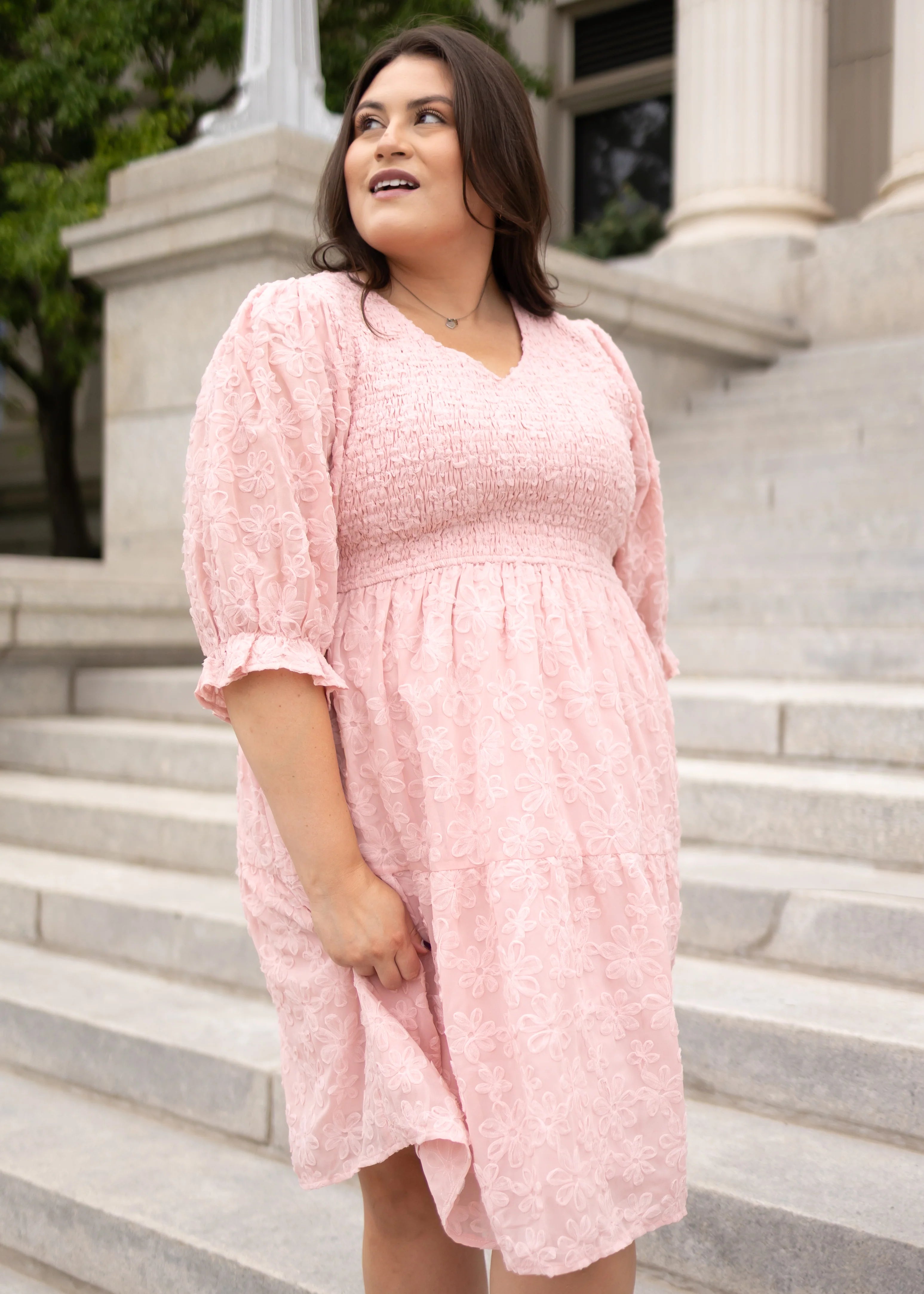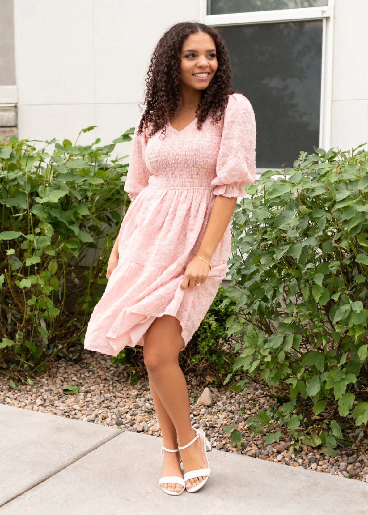 Romantic and effortlessly flattering, the Robin Dress is designed with soft blush pink textured fabric and dainty floral details. A smocked bodice adds all-day comfort and shape, while the flowy skirt and short sleeves keep it breezy and beautiful.