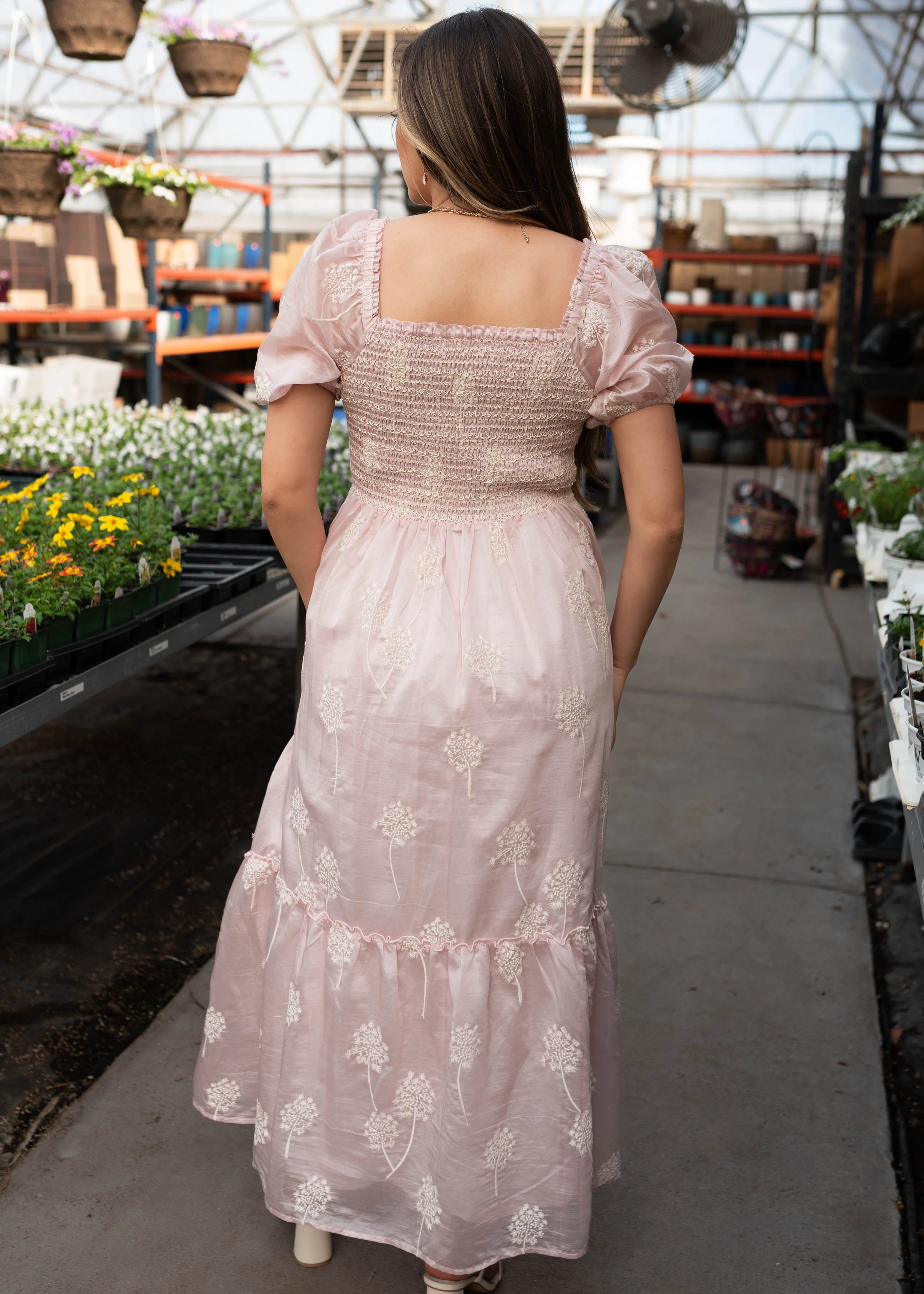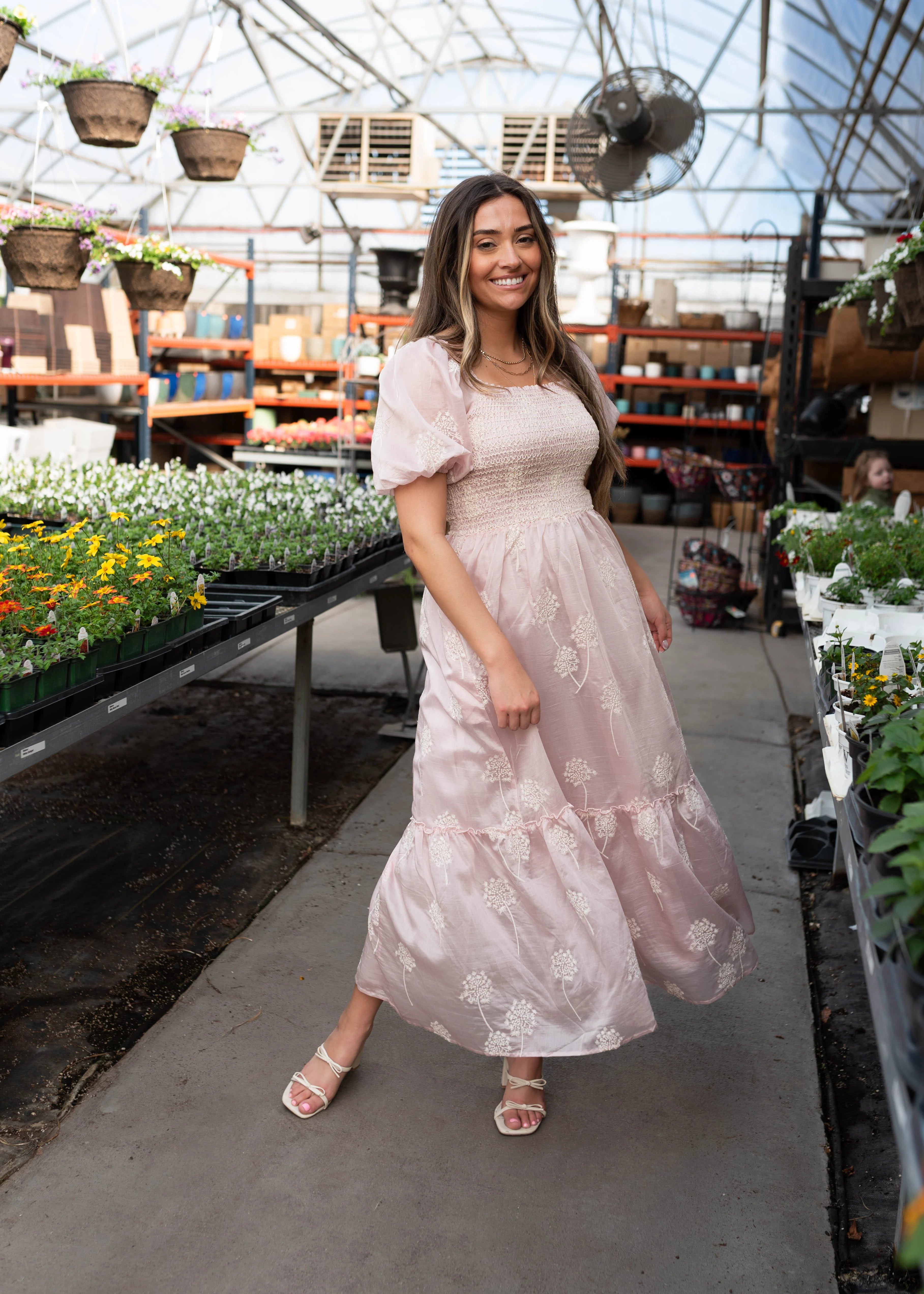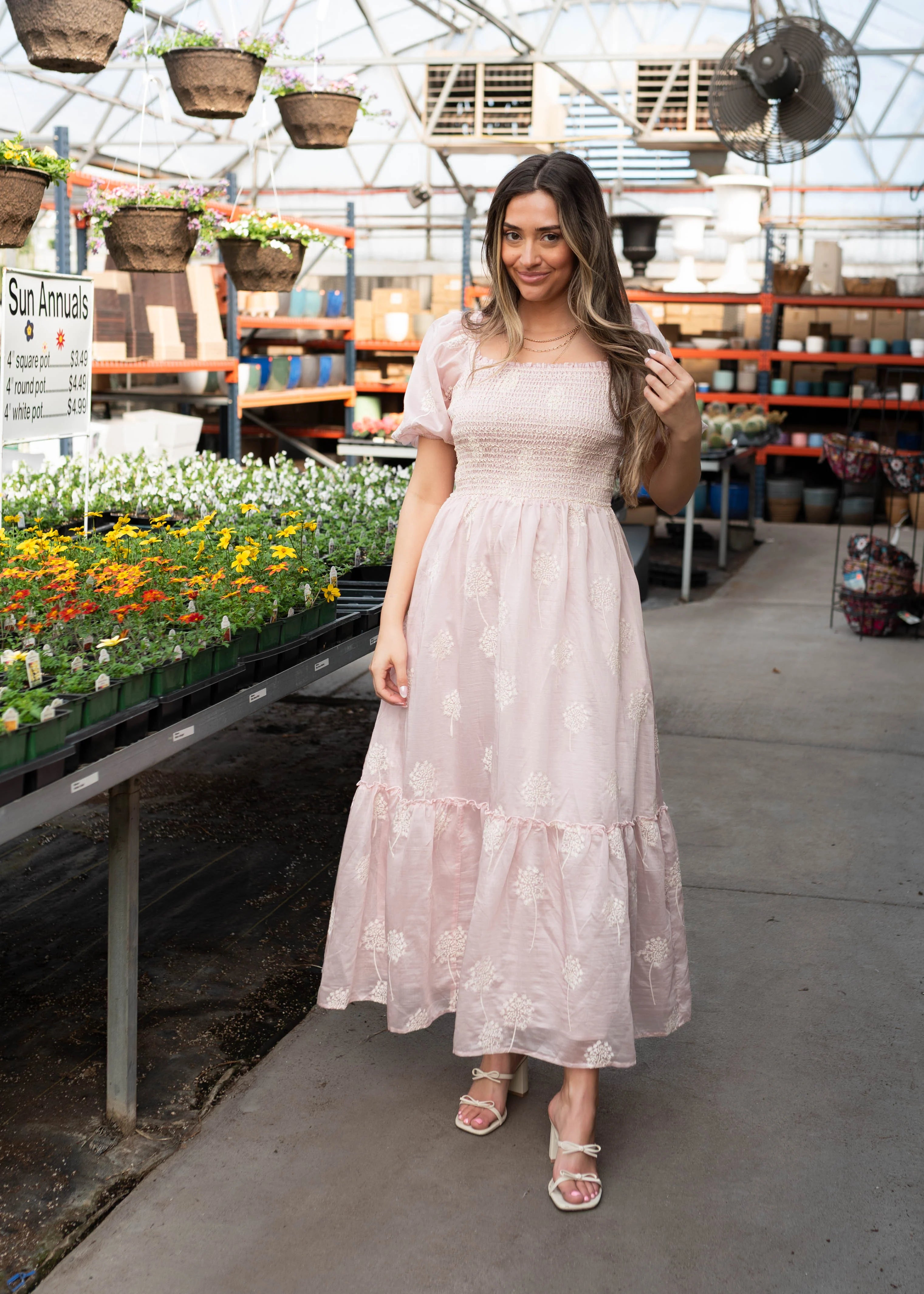 Soft, sweet, and full of the prettiest details — the Roselynn Pink Smocked Dress is one of those pieces that feels extra special the moment you put it on. Designed with delicate embroidered flowers on a soft pink base, this dress features a flattering square neckline and a smocked bodice that creates a comfortable, flexible fit. The puff sleeves add a classic feminine touch, while the structured silhouette is balanced with practical details like a side zipper and full lining. And of course… it has pockets.