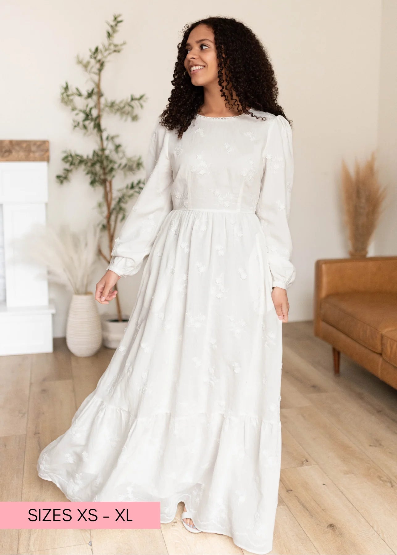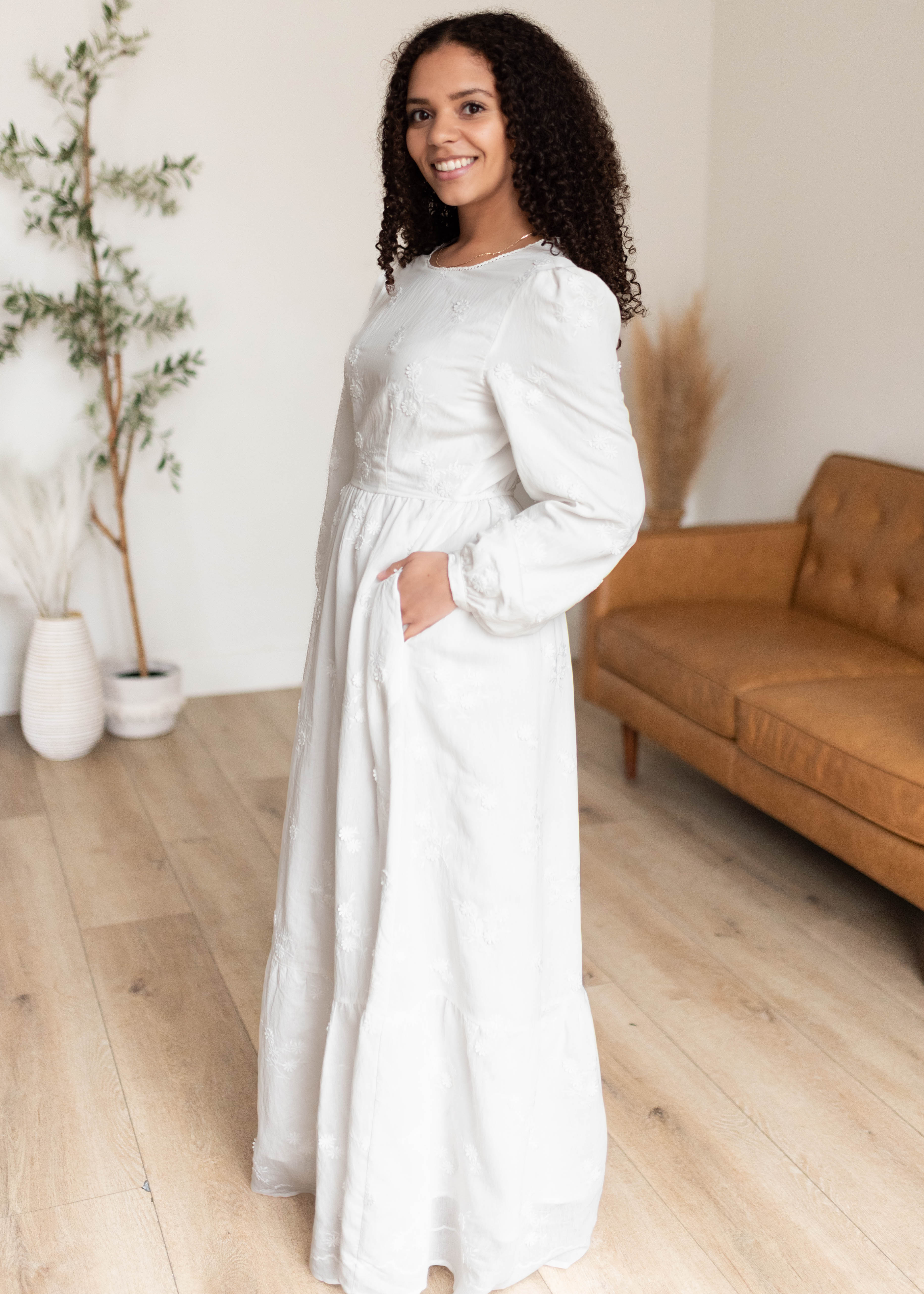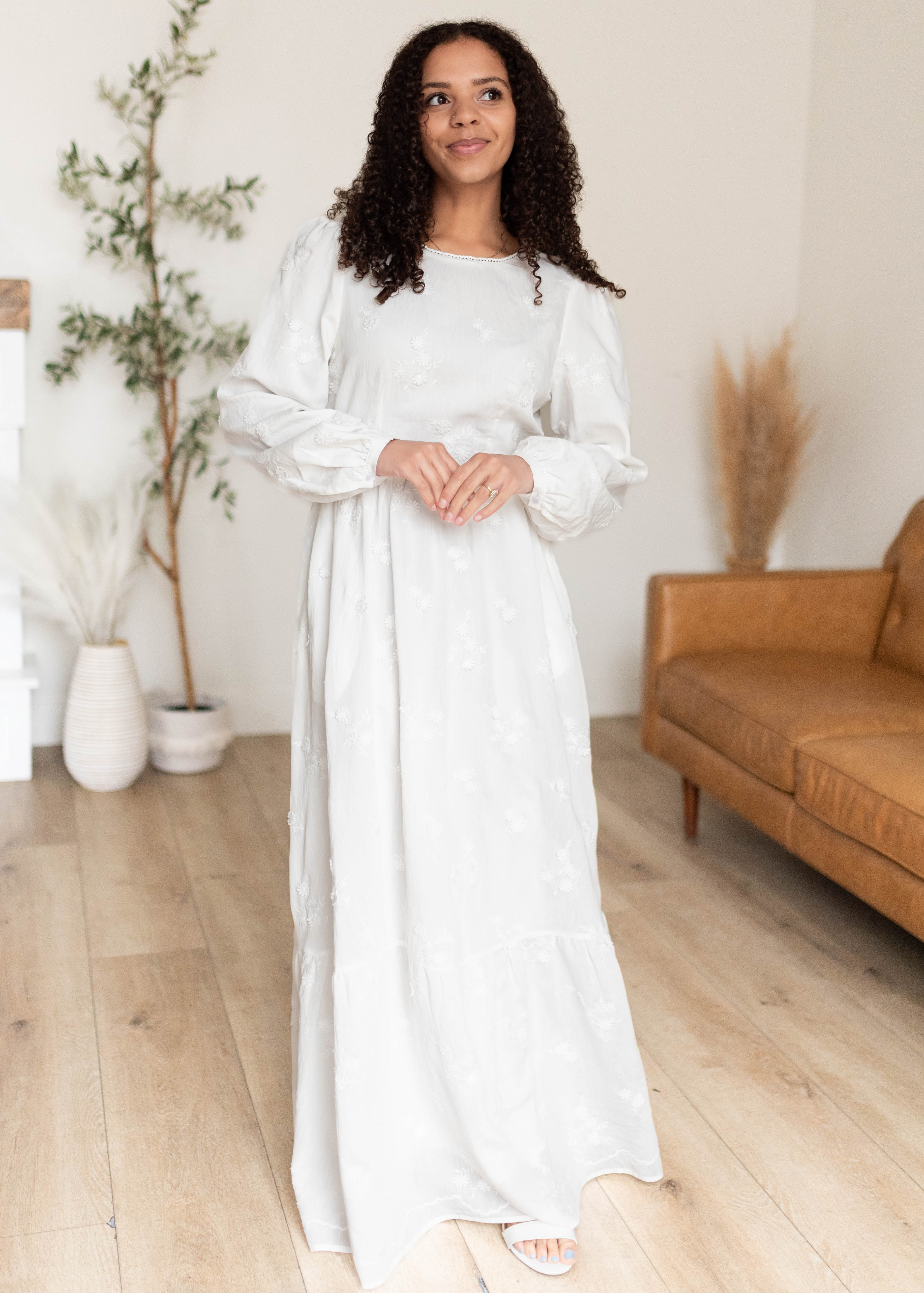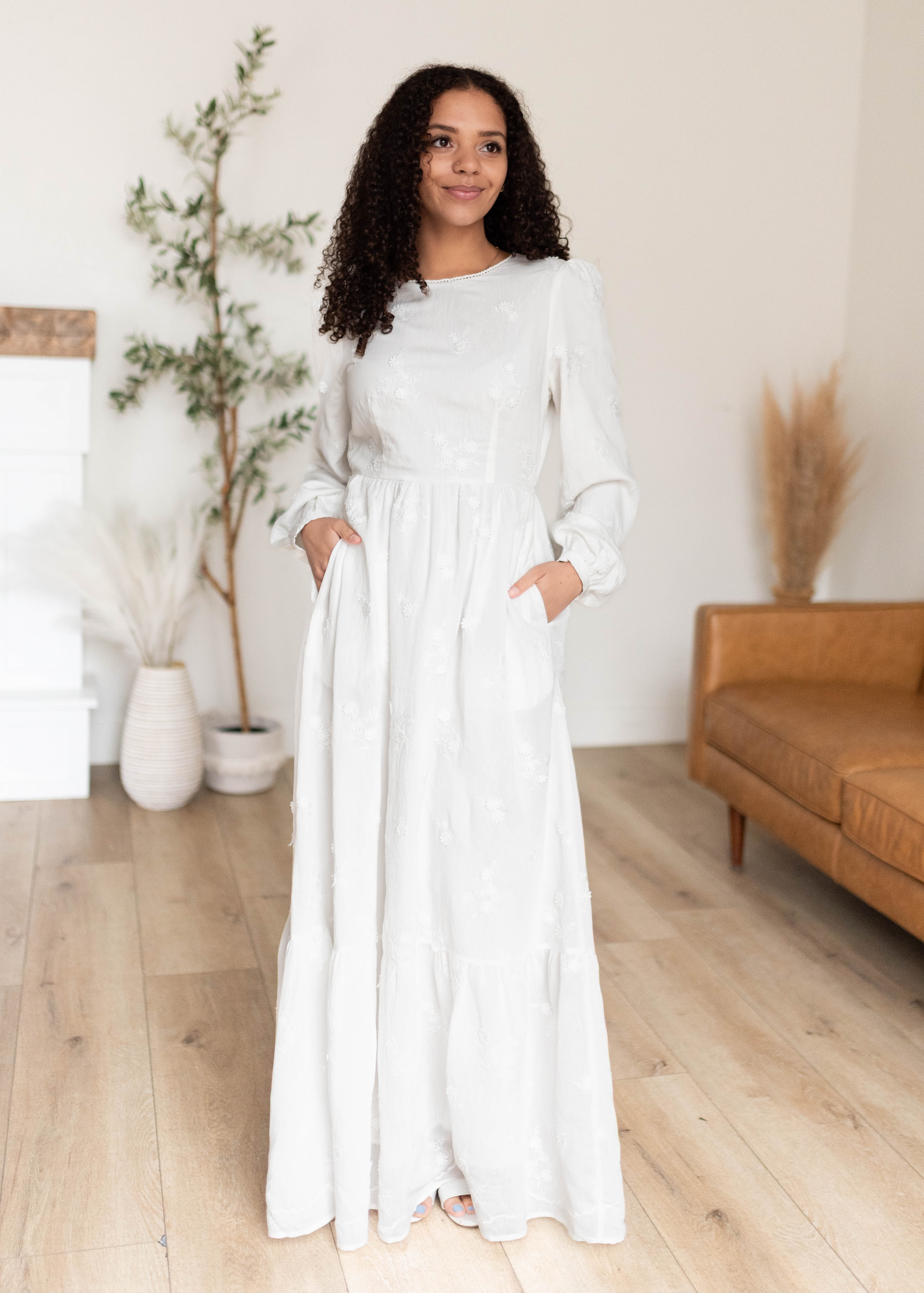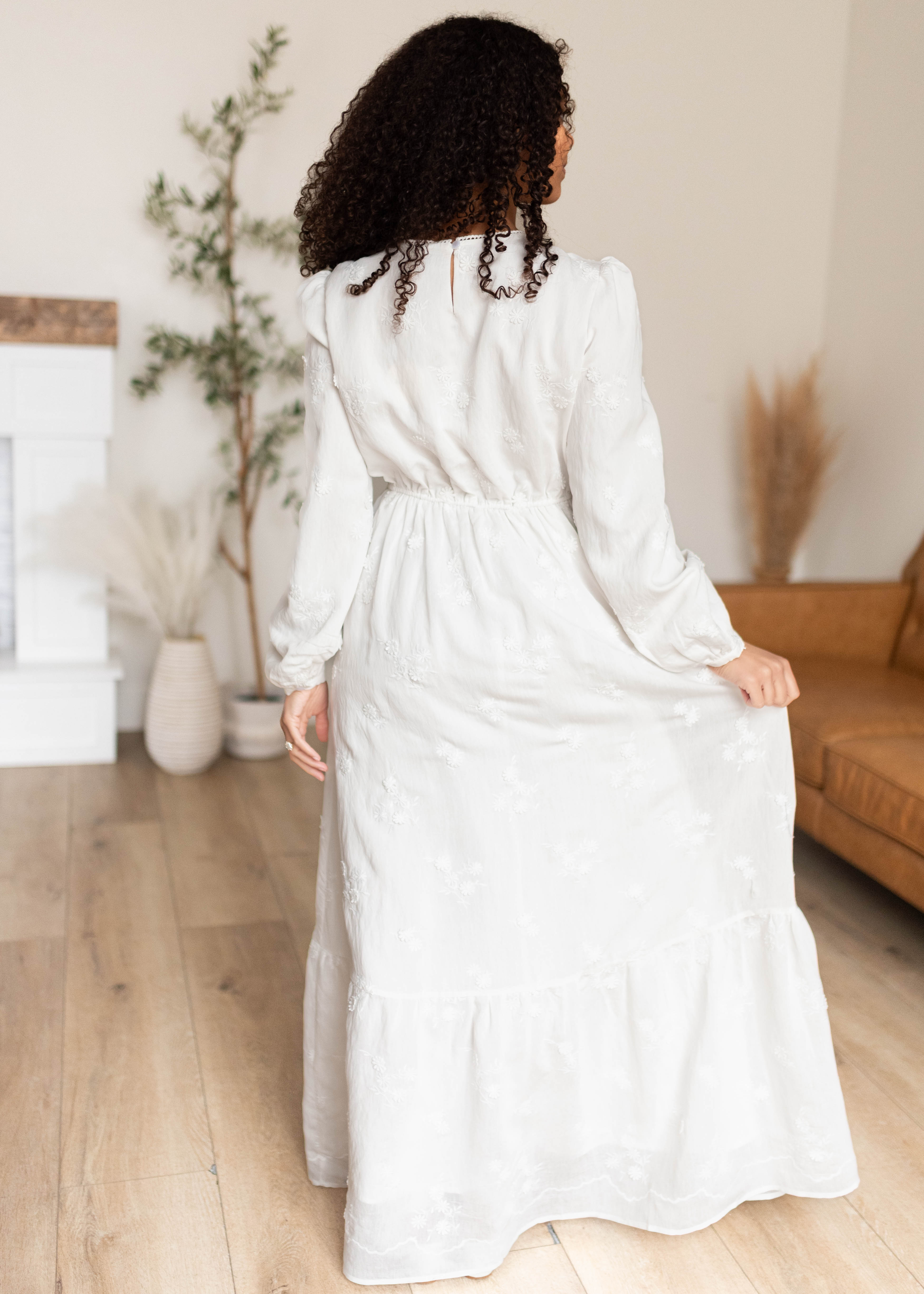 Elegant, feminine, and effortlessly beautiful — the Shelby White Floral Dress is a standout piece designed to make you feel instantly put together. Featuring delicate embroidered florals throughout, this maxi dress combines timeless detail with an easy, comfortable fit. The high crew neckline and long sleeves offer lovely coverage, while the tiered skirt creates soft movement that feels both graceful and flattering. Fully lined with pockets, this is one of those dresses you’ll reach for when you want something extra special without sacrificing comfort.