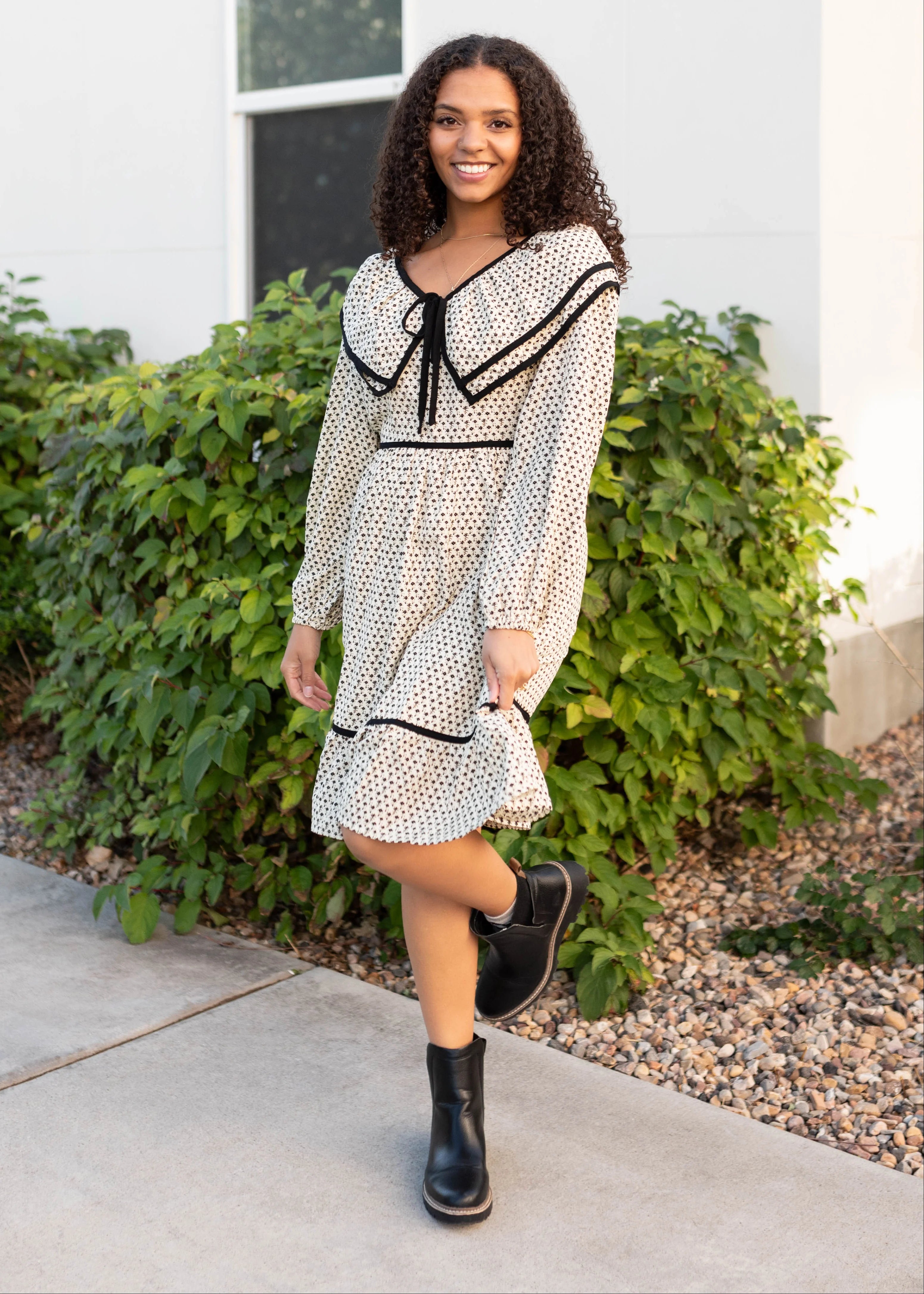 The Tatiana Dress is feminine, flowy, and full of pretty details. Featuring an oversized collared neckline with a sweet tie, it strikes the perfect balance between playful and polished. The elastic waist gives it an easy, flattering fit, while the single-tier skirt and half lining keep it breezy and comfortable. With side pockets to finish the look, this dress is as practical as it is pretty!